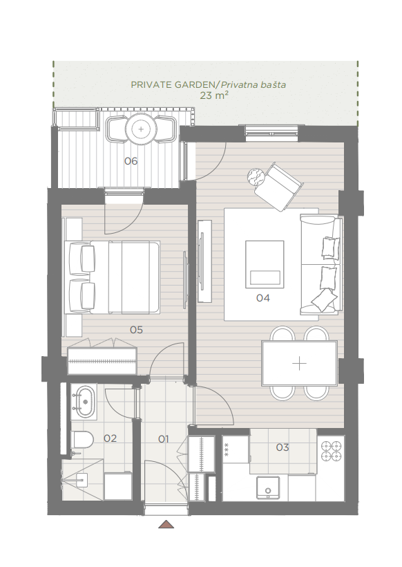 Structure of the apartment: hallway, living room with kitchen and dining table, a bedroom, a bathroom and a terrace. The apartment itself has 47,9m2, while its private garden has 21,2m2. It will be delivered with finished floor, finished tiles, equipped bathroom and equipped air conditioning.