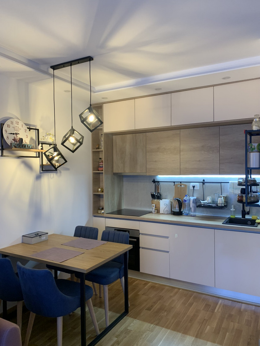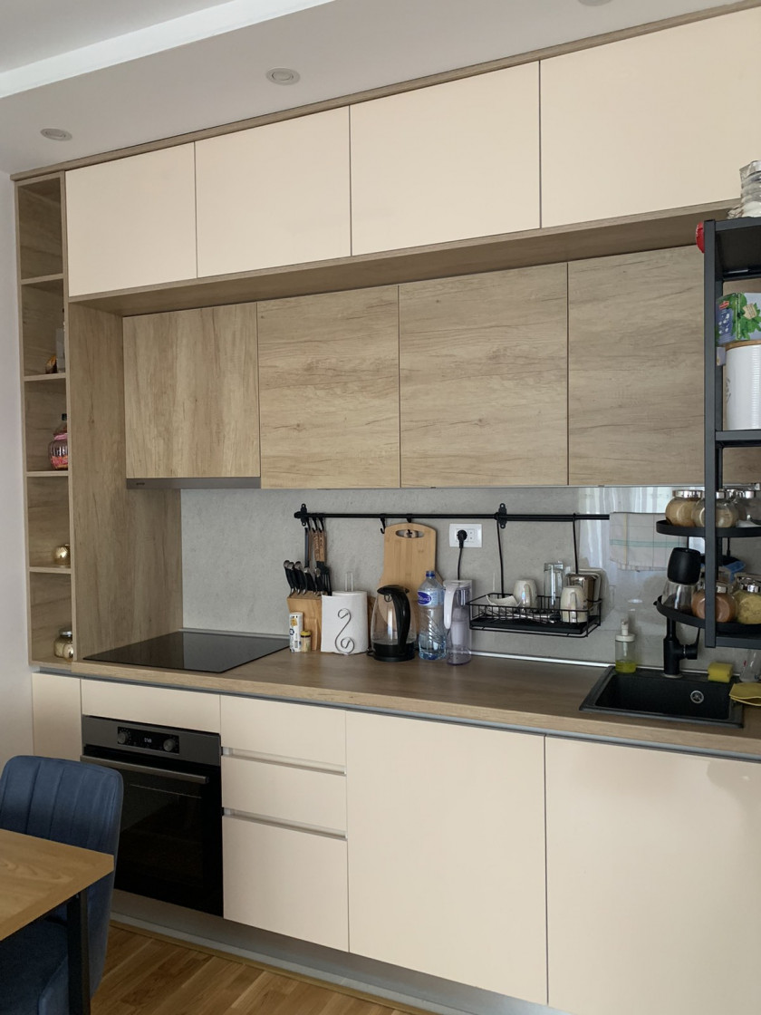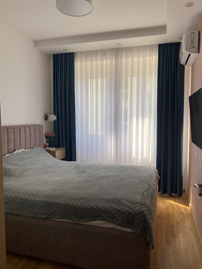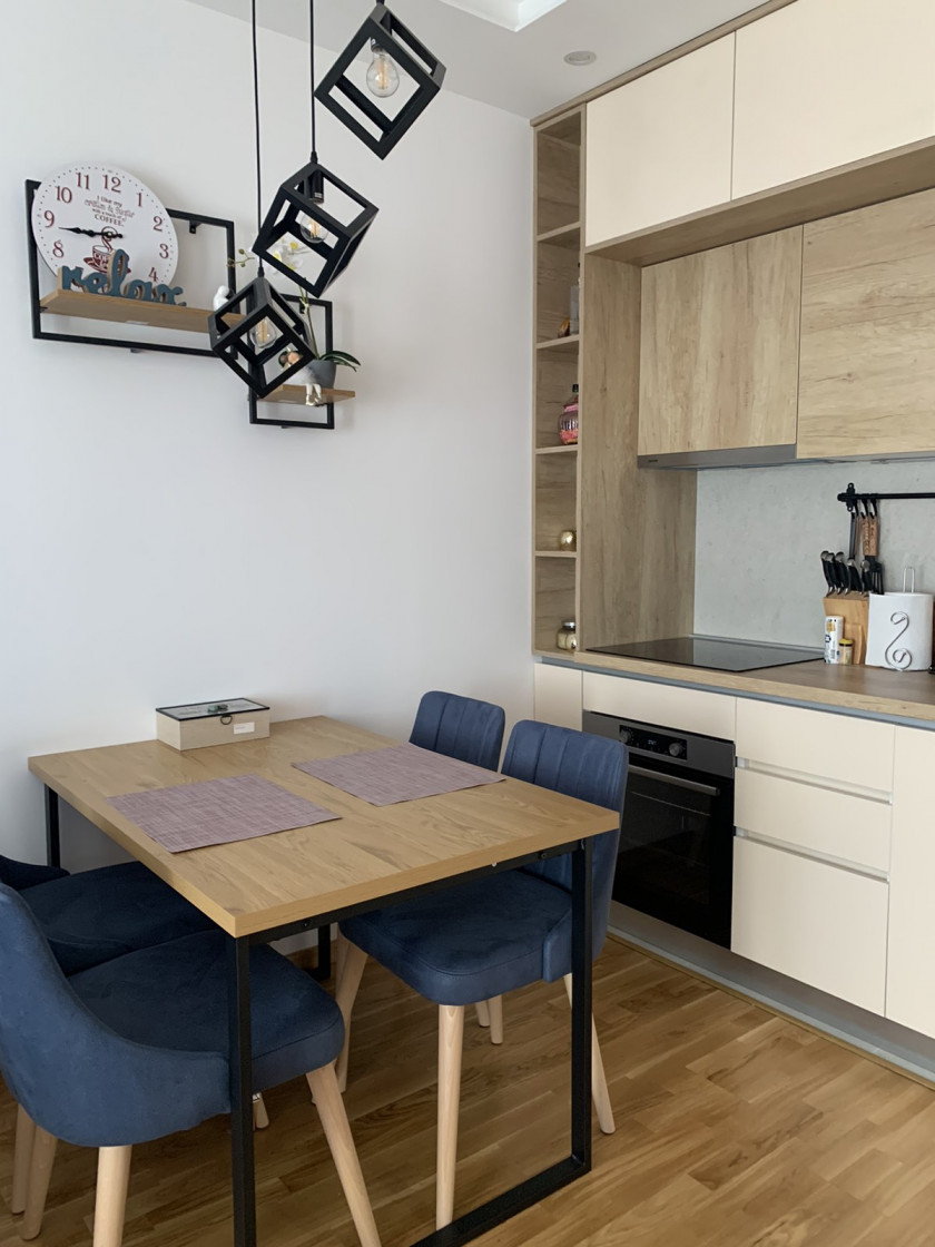 The apartment is fully furnished with new, modern furniture and high-quality appliances.