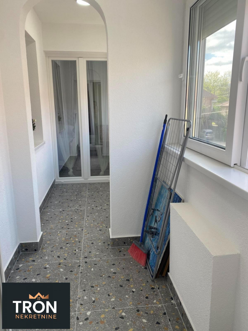 Površina stana je 70m2, sastoji se iz dnevne sobe sa kuhinjom i trpezarijom, dve spavace sobe, hodnika, kupatila, i veliku ograđenu terasu.