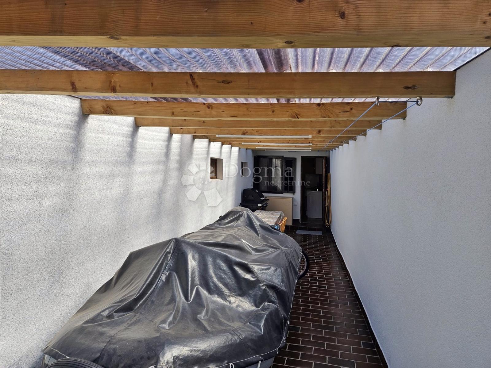 Ispred kuće nalazi se prostrana terasa od otprilike 20 m², savršena za druženja, objedovanje na otvorenom ili uživanje u sunčanim danima.
