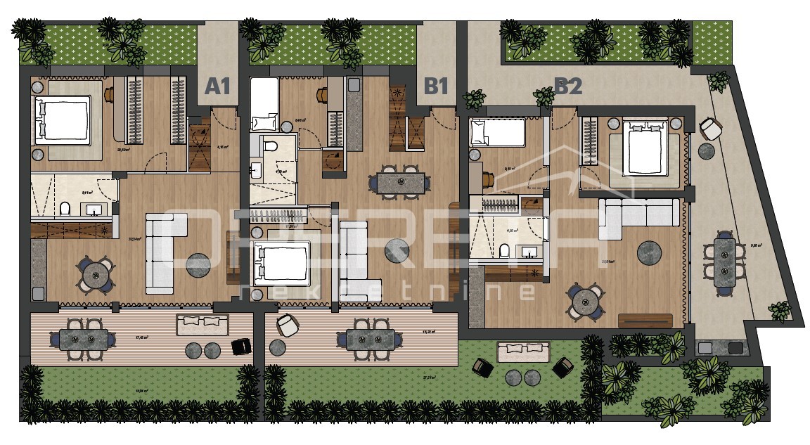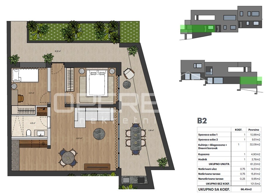 Description (Croatian): PRODAJA STANA, REMETE, NOVOGRADNJA, 86,45M2, 3-soban.Prodaje se vrhunska novogradnja na odličnoj, mirnoj lokaciji u jednom od najtraženijih dijelova grada u blizini Maksmirske šume, osnovne škole, internacionalnih škola na Fratrovcu, vrtića, prodavaonice, a autobusna linija koja vodi na Svetice i Kaptol je ispred same zgrade.Manja, luksuzna zgrada sa svega 4 stana osigurava osjećaj privatnosti i intime.U gradnji će biti korišteni samo vrhunski materijali i oprema (parket prve klase, vrhunska keramika i sanitarije premium brendova, unutarnja vrata sa skrivenim pantima i integriranim dovratnicima u ravnini zida), te visina stropova od 3,00m i velikim staklenim stijenama sa alu žaluzinama doprinijeti će osjećaju luksuza.Svaki stan dolazi sa jednim garažnim i jednim vanjskim parkirnim mjestom.Stan B2 stambene kvadrature 61,23m2 sa prostranom, djelomično natkrivenom terasom sastoji se od prostranog boravka sa kuhinjom i blagovaonicom, dvije spavaće sobe te ulaznog prostora i kupaonice.Rok dovršetka proljeće 2027.g.