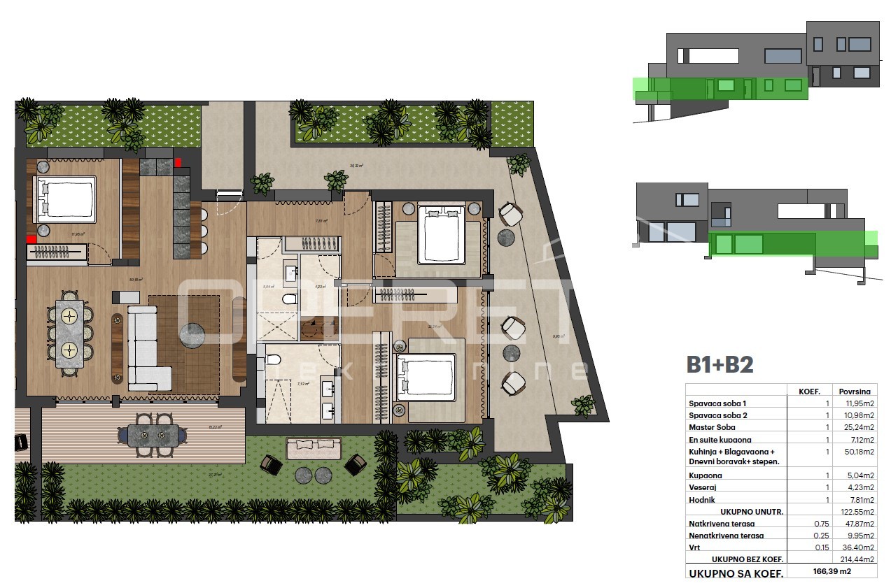 Description (Croatian): PRODAJA STANA, REMETE, NOVOGRADNJA, 166,39m2, 4-soban.Prodaje se vrhunska novogradnja na odličnoj, mirnoj lokaciji u jednom od najtraženijih dijelova grada u blizini Maksmirske šume, osnovne škole, internacionalnih škola na Fratrovcu, vrtića, prodavaonice, a autobusna linija koja vodi na Svetice i Kaptol je ispred same zgrade.Manja, luksuzna zgrada sa svega 4 stana osigurava osjećaj privatnosti i intime.U gradnji će biti korišteni samo vrhunski materijali i oprema (parket prve klase, vrhunska keramika i sanitarije premium brendova, unutarnja vrata sa skrivenim pantima i integriranim dovratnicima u ravnini zida), te visina stropova od 3,00m i velikim staklenim stijenama sa alu žaluzinama doprinijeti će osjećaju luksuza.Svaki stan dolazi sa jednim garažnim i jednim vanjskim parkirnim mjestom.Stan B1+B2 stambene kvadrature 122,55m2 sa prostranom natkrivenom terasom, nenatkrivenom terasom i vrtom sastoji se od prostranog boravka sa kuhinjom i blagovaonicom, master spavaće sobe sa vlastitom kupaonicom, 2 dodatne spavaće sobe, kupaonice i vešeraja.Dovršetak gradnje proljeće 2027.g.