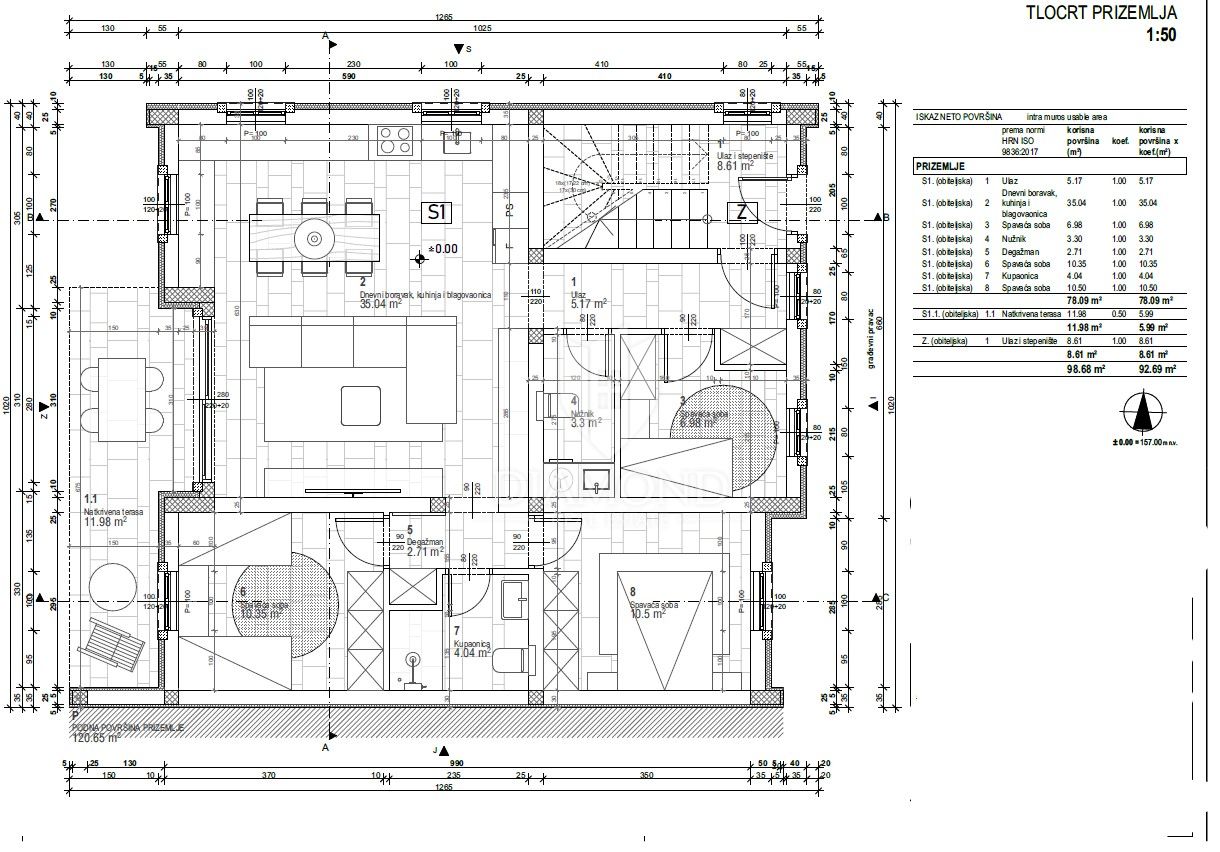Stan se nalazi u prizemlju i nudi sve što obiteljski dom treba imati – prostranost, funkcionalnost i dodir prirode. Na 84 m² raspoređeni su ulazni prostor, tri udobne spavaće sobe, gostinjski WC, kupaonica te svijetao open space dnevni dio s kuhinjom i blagovaonicom koji izlazi na natkrivenu terasu i vlastiti dio okućnice.