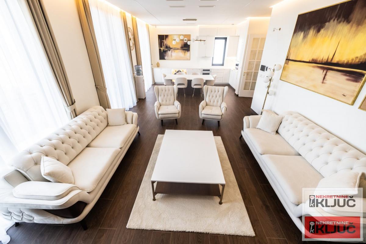Raspored stana je: dnevni boravak, trpezarija, kuhinja, tri spavace sobe, dva kupatila, dva hodnika i tri terase....