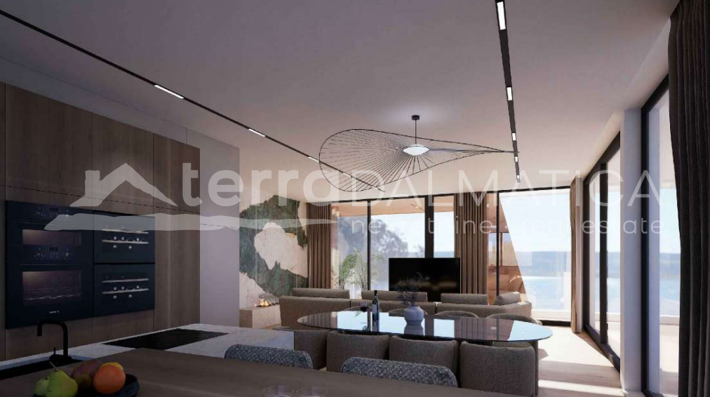Description: We present to you a superb penthouse in the first row to the sea, located in picturesque Sukošan, a stone's throw from Zadar, where luxury meets the beauty of the Adriatic. This exclusive property offers a unique experience of living by the Adriatic, combining top comfort, sophisticated design and a panoramic view of the endless blue of the sea. Entry to the penthouse is provided by a private elevator that leads directly to the unit itself, providing complete privacy and exclusivity. Next to the elevator there is also an elegant staircase that leads to the entrance area. The entrance opens into a spacious, natural light-lit living room, kitchen and dining room. The entire living area is decorated with a stunning panoramic view of the Adriatic Sea, creating the impression that the sea is an extension of your home. The penthouse has three spacious bedrooms, each of which has its own luxurious bathroom, which guarantees maximum comfort and privacy. In addition, the apartment includes two more elegant toilets, an engine room and a modern designed staircase that leads to a spectacular roof terrace....