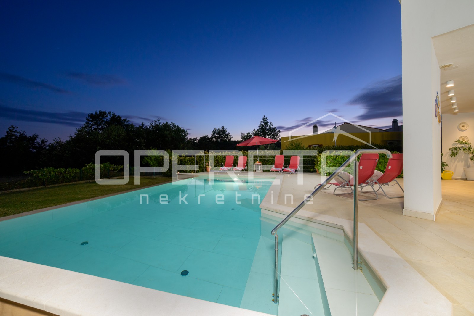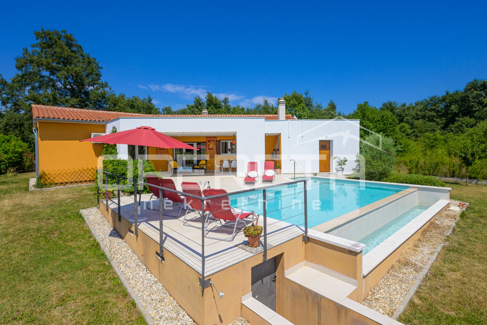 Description: For sale is an attractive modern villa located in the heart of central Istria, in a peaceful setting not far from the magical medieval town of Svetvinčenat. This elegant single-storey house, built in 2018, is characterized by contemporary architecture and a carefully decorated interior that exudes style and sophistication. The villa is located on a plot of 1,059 m², while the living area itself is 170 m².The interior of the house is designed to provide maximum comfort. It consists of three modernly decorated bedrooms, each with its own bathroom, a spacious living room and a kitchen with a dining area and an outdoor storage room.The entire property is air-conditioned, and an additional luxury is provided by a sauna — perfect for relaxation at any time of the year. The living room and dining room lead out onto a large covered terrace with a built-in fireplace, ideal for socializing and evening gatherings. Next to the terrace is a large swimming pool surrounded by deck chairs, creating the perfect area for sunbathing and relaxing....