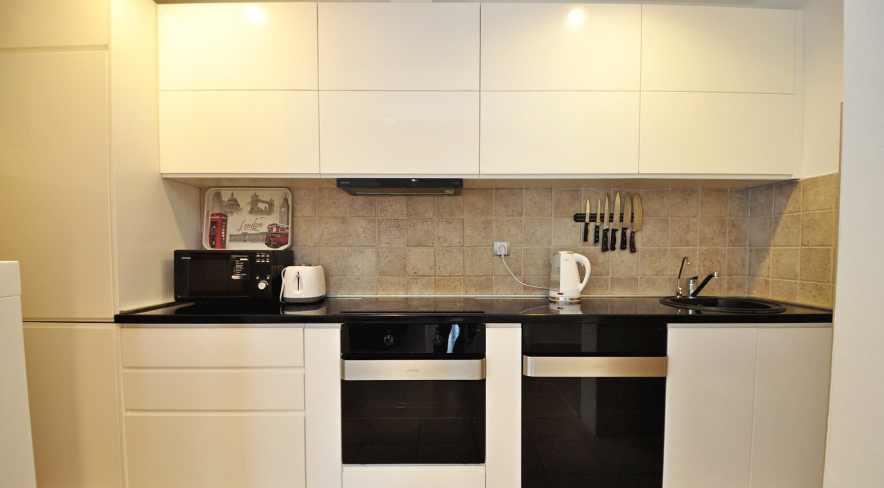 The apartment features: an entrance hall, a living room with a seating area, modular furniture, and a TV; a separate kitchen area equipped with all necessary appliances; two bathrooms, one of which is a full bath; and two bedrooms.