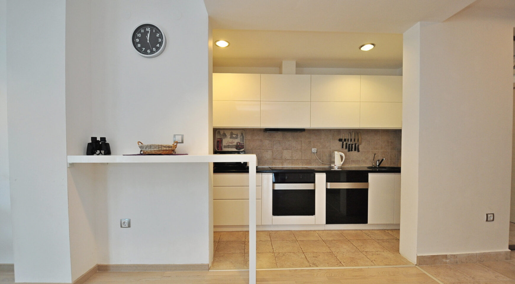 The apartment is located in a modern complex (built in 2013) featuring a large gated community, ample parking, two swimming pools, and a spacious garden. The complex is just a 5-6-minute walk from the coastline and the nearest beach.