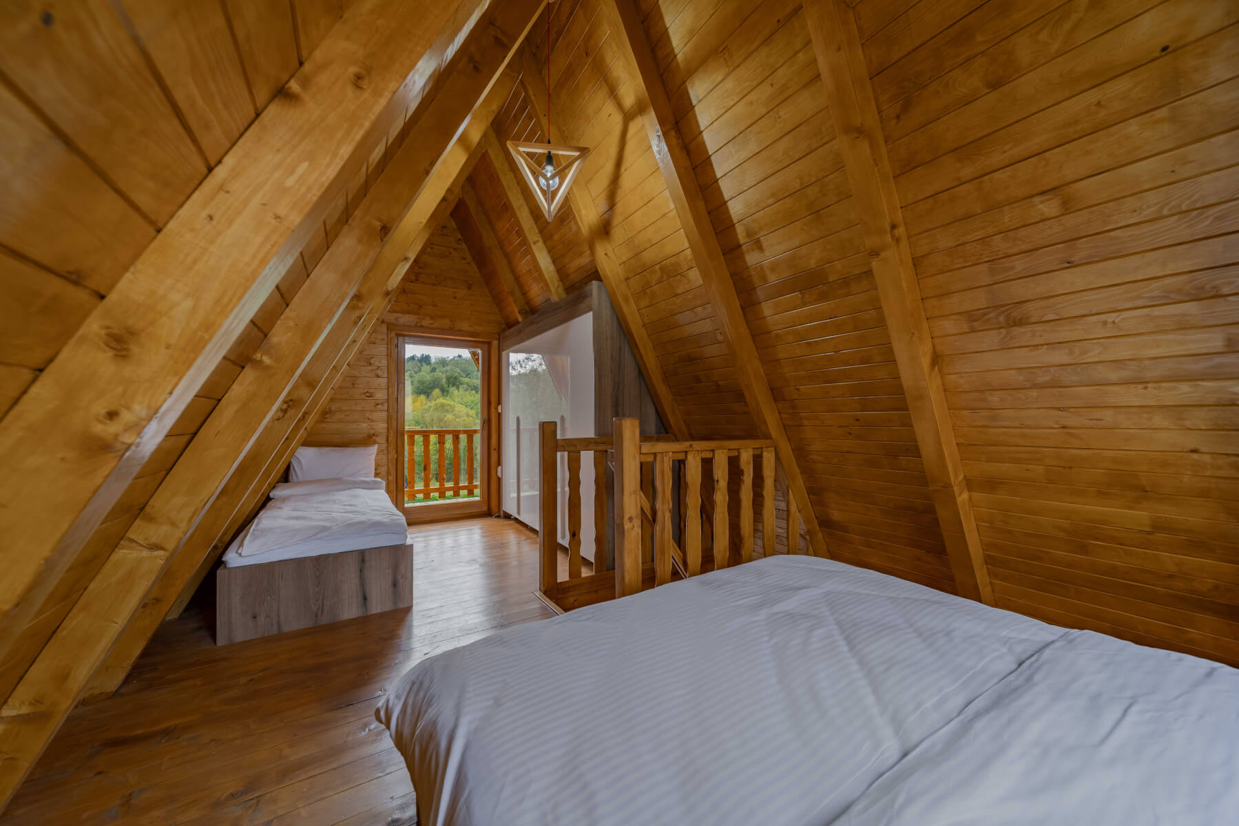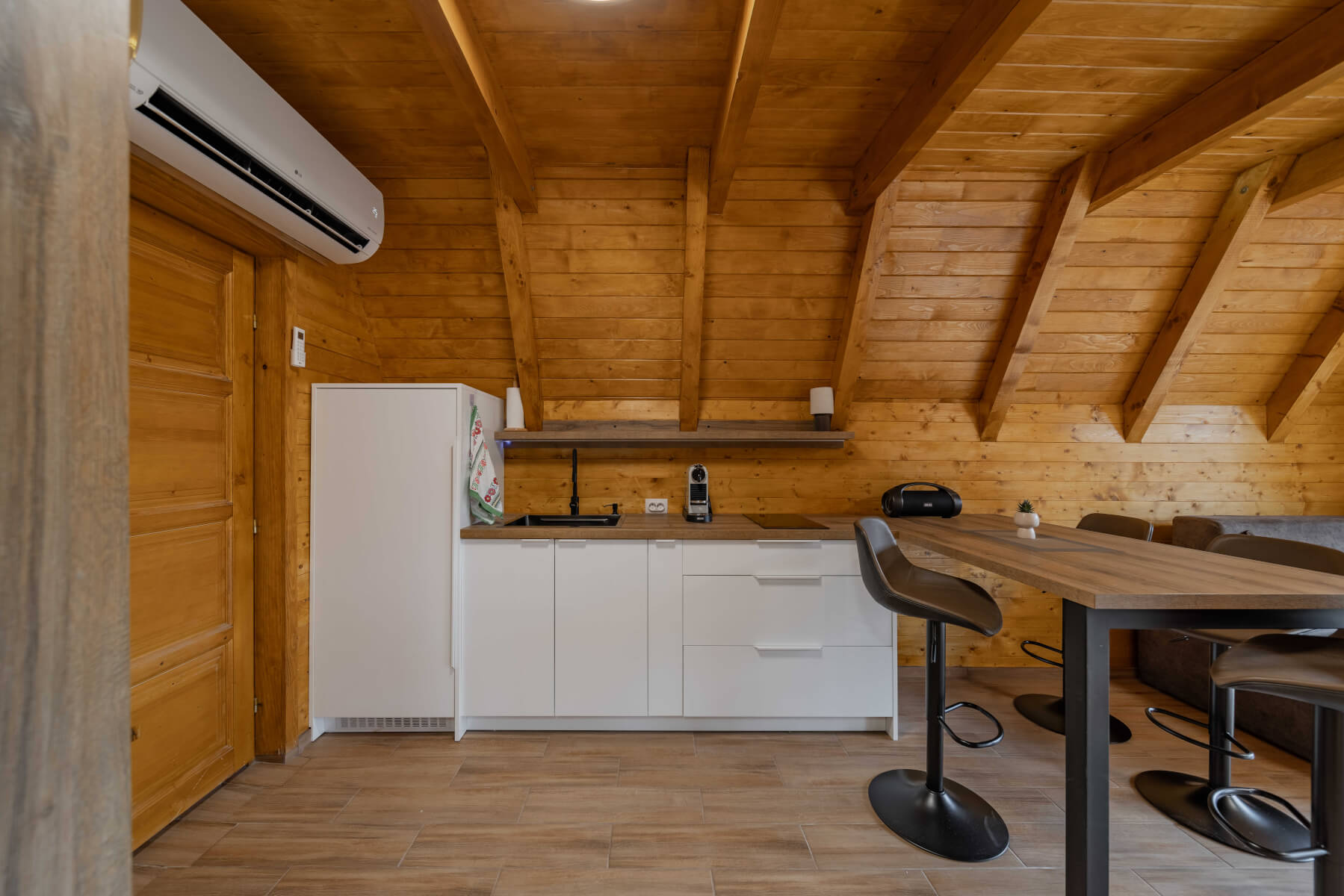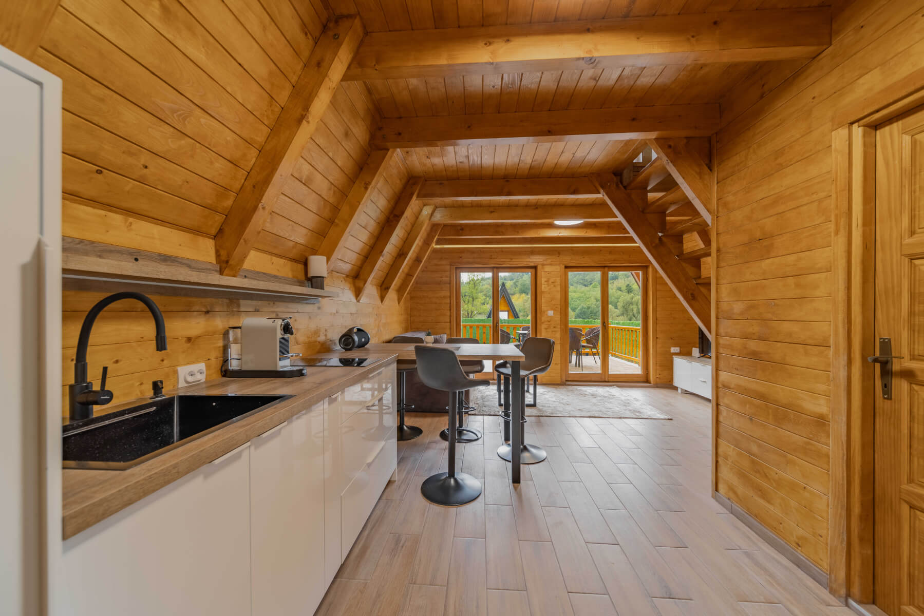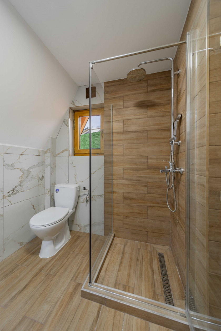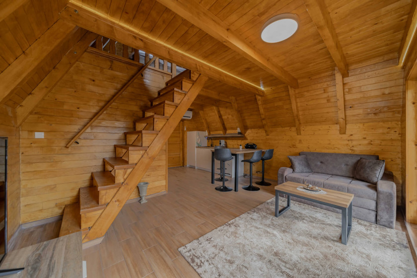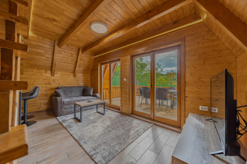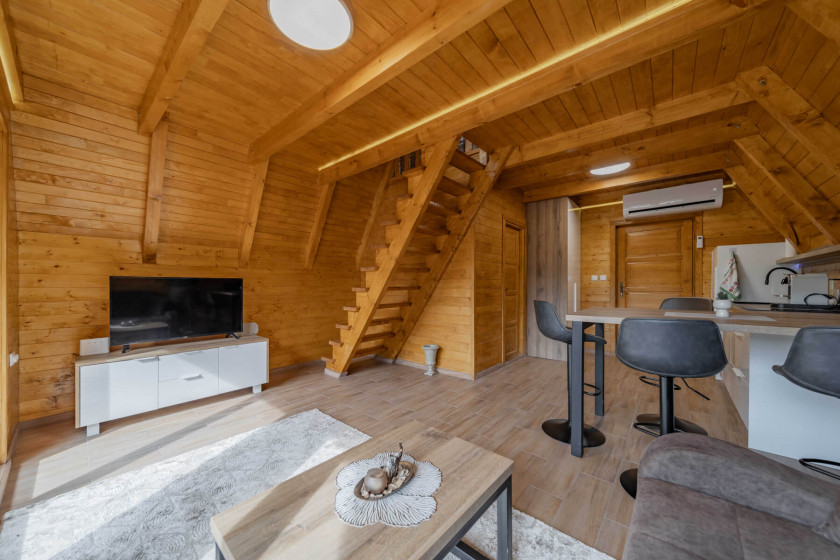 This modern 50 m² log cabin, with a capacity of up to 6 people, offers the perfect blend of comfort and rustic charm. The warm wooden interior, spacious living room and fully equipped kitchen create a pleasant atmosphere for a stay all year round. During the summer, guests can enjoy the private pool, while in the winter the house offers peace, comfort and beautiful views of nature.