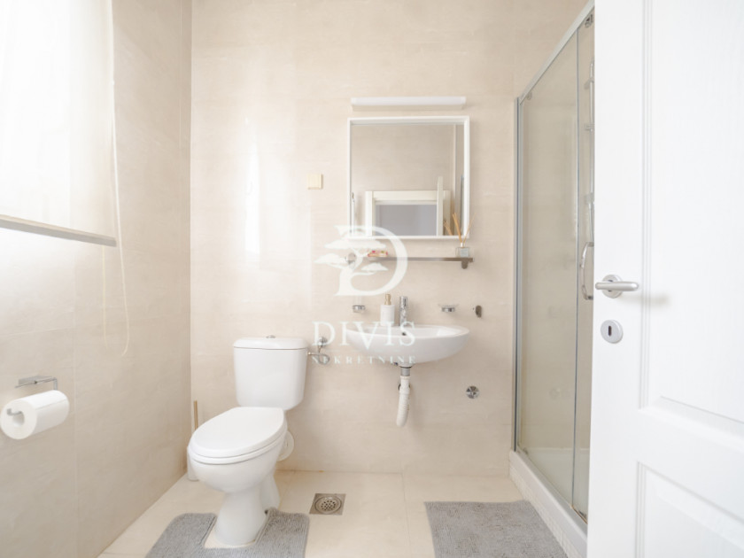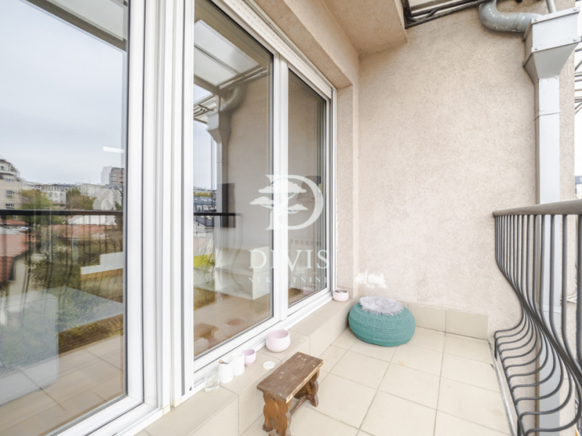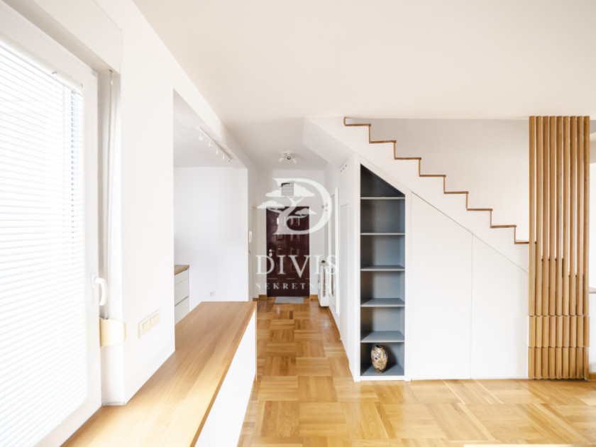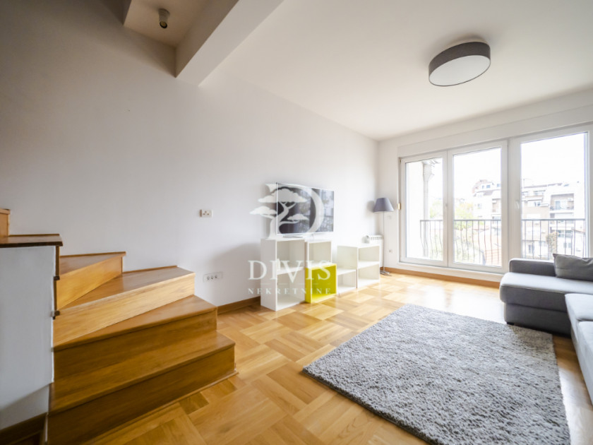 Pozicioniran je na četvrtom i petom spratu i organizovan u dve etaže. Na donjoj etaži se nalaze ulazni hodnik, kupatilo, prostrana kuhinja i dnevni boravak sa trpezarijom i izlazom na terasu. Na gornjoj etaži su dve spavaće sobe i još jedno kupatilo. Jedna soba ima blagu kosinu i krovni prozor, dok visina plafona u stanu varira od standardnih 2,7 metara do 3,2 metra u najvišem delu, što prostoru daje dodatnu visinu i svetlost. Stan je u odličnom stanju, ne zahteva nikakva dodatna ulaganja.