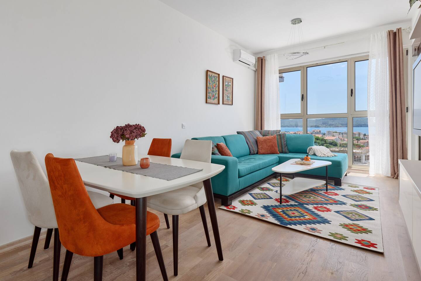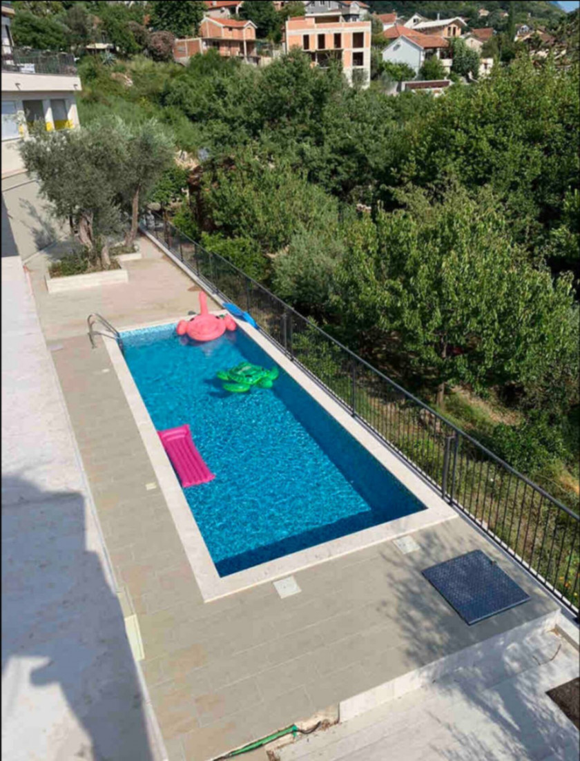 Tivat one-bedroom 53sqm apt, pool, sea view & garage - for rent (available now)