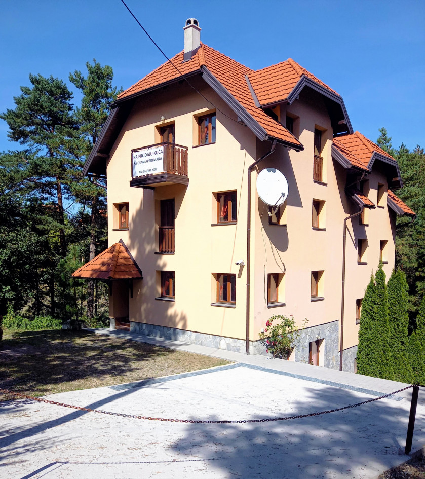 Opis: Prodajem višeporodični stambeni objekat na planini Tari u centru Kaludjerskih bara, neto površine 332 m2, na uredjenom placu od 540 m2. Plac sa objektom je upisan u katastru nepokretnosti Užice, KO Kremna kao isključivo vlasništvo prodavca i poseduje gradjevinsku i upotrebnu dozvolu. Raspolaže sa 7 dvosobnih i jednim studio apartmanom potpuno opremljenim za iznajmljivanje. Grejanje je centralno kotlom na pelet. Objekat se nalazi u blizini hotela ‘’Omorika’’ i okružen je borovom šumom.