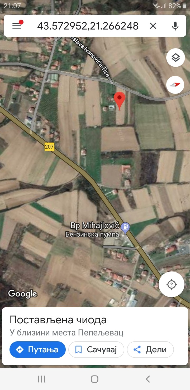 Opis: Prodajem plac u Pepeljevcu 5 km udaljenom od Krusevca.Plac ima 44,5 ari i udaljen je oko dvesta metara od regionalnog puta Krusevac-Aleksandrovac.Trenutna namena je poljoprivredno zemljište, ali zahvaljujući lokaciji i blizini kompletne infrastrukture(struja,voda,gas)zemljište je izuzetno pogodno za prenamenu u građevinsko.Prednost lokacije :samo 10 minuta od Kruševca,odlična povezanost sa glavnim putem,prirodno i mirno okruženje.Plac svojim položajem i površinom pruža brojne mogućnosti za investicije.Plac je uknjizen,vlasnistvo regulisano.Cena 700 e po aru.