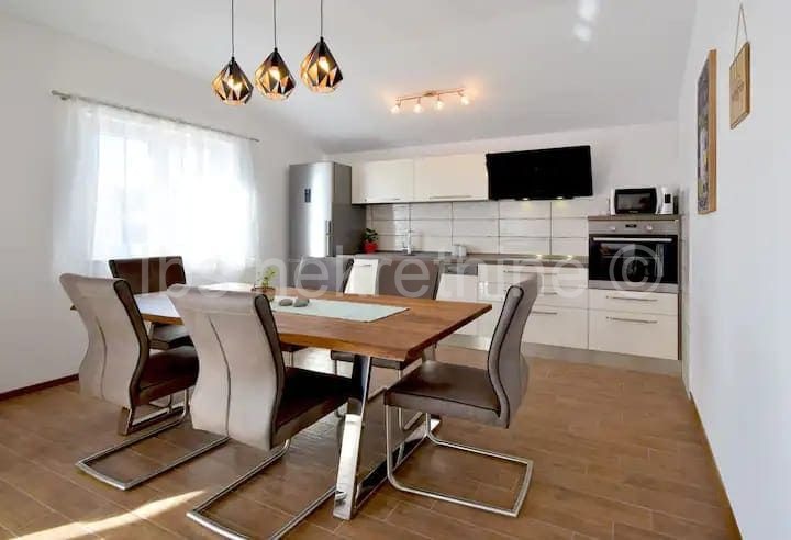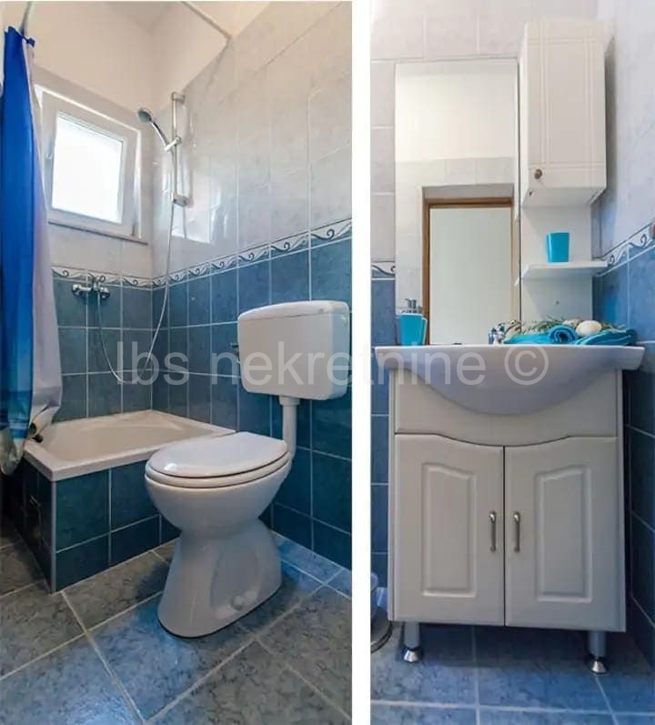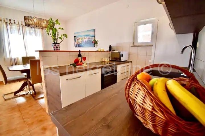Prizemlja na kojem se nalaze tri spavaće sobe, dvije kupaonice, kuhinja, blagavaonica, dnevni boravak te balkon ukupne površine 115,3 m2.Kata površine također sa tri spavaće sobe, dvije kupaonice, kuhinja, blagavaonica, dnevni boravak te terasa sa pogledom na more površine 114,55 m2.Podruma sa garažom površine 56,73 m2Cijela kuća je u potpunosti uređena i namještena, nova fasada sa toplinskom izolacijom.Sve sobe i prostorije su klimatizirane.