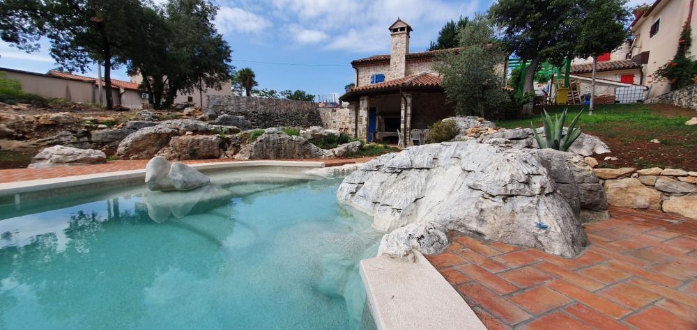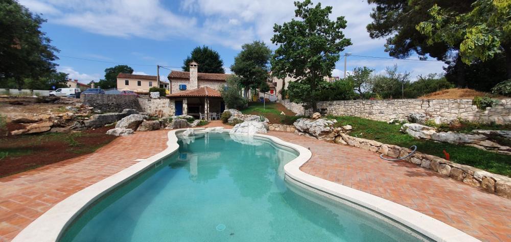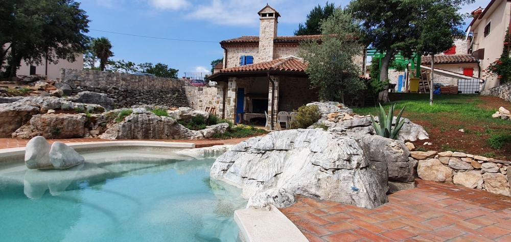 Opis (Engleski): A stone beautiful villa with a swimming pool in Kršan area near Labin and Brestova bay!It has an area of 233 m2 and consists of a basement, ground floor and first floor. In the basement there is a covered terrace of 35 m2, a bathroom and a storage room. The ground floor also consists of a covered terrace of the same area, a sauna, a tavern/konoba with a fireplace, a kitchen, a living room and a guest wc. The first floor offers hallway, two bedrooms, a bathroom and a balcony. On the spacious 2300 m2 garden there is a beautiful swimming pool, a summer kitchen and an auxiliary facility. The auxiliary building in the basement has an apartment in a high renovation phase, meant for guests, and a boiler room, while on the ground floor there is a garage with two parking spaces that can be arranged as desired. Then there is another bathroom and a prepared installation for the apartment in the basement. The house is connected to the septic tank and offers the possibility of central heating with gas, wood or air conditioning. A parking lot next to the house....