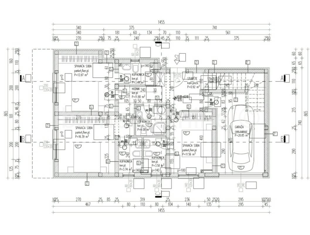 Na prvoj etaži je smještena garaža, tri spavaće sobe sa kupaonicama, hodnik i kupaonice.