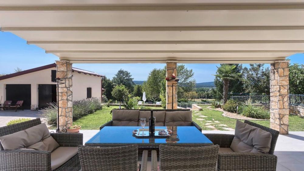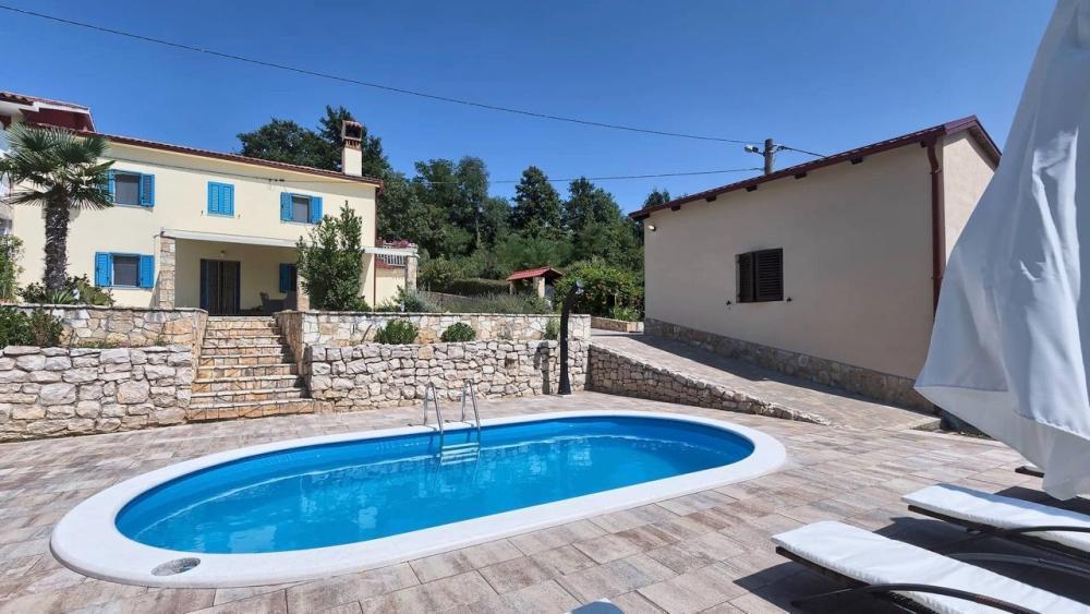 Opis (Engleski): Traditional villa with swimming pool for sale in Kršan 5 km from the sea.Total area is 230 sq.m. Land plot is 993 sq.m.Reconstruction is completed in 2022.The house consists of two floors. On the ground floor there is a living room, a kitchen with a dining room, a bathroom and a staircase, while on the first floor there are three spacious bedrooms, a bathroom and a nice large terrace. The villa is sold furnished with very expensive furniture and lighting from all over the world. In front of the house there is a very nice covered terrace with a view of greenery and mountains. The garden also includes a swimming pool, an auxiliary building that serves as a studio apartment, a barbecue, a woodshed and a tavern. Heating in the house is central with fuel oil. The house is rented during the summer months and is doing very well. Return on investment is guaranteed in a reasonable time. Ownership is clean. The facilities are all legalized. Agent's recommendation. The price is not fixed! From Shore (m): 5000. Ref: RE-U-21566