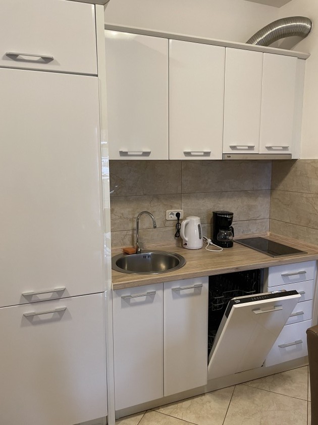 Kuhinja kompletno opremljena,zamrzivac ,masina za sudje... 5 minuta pjeske do mora.