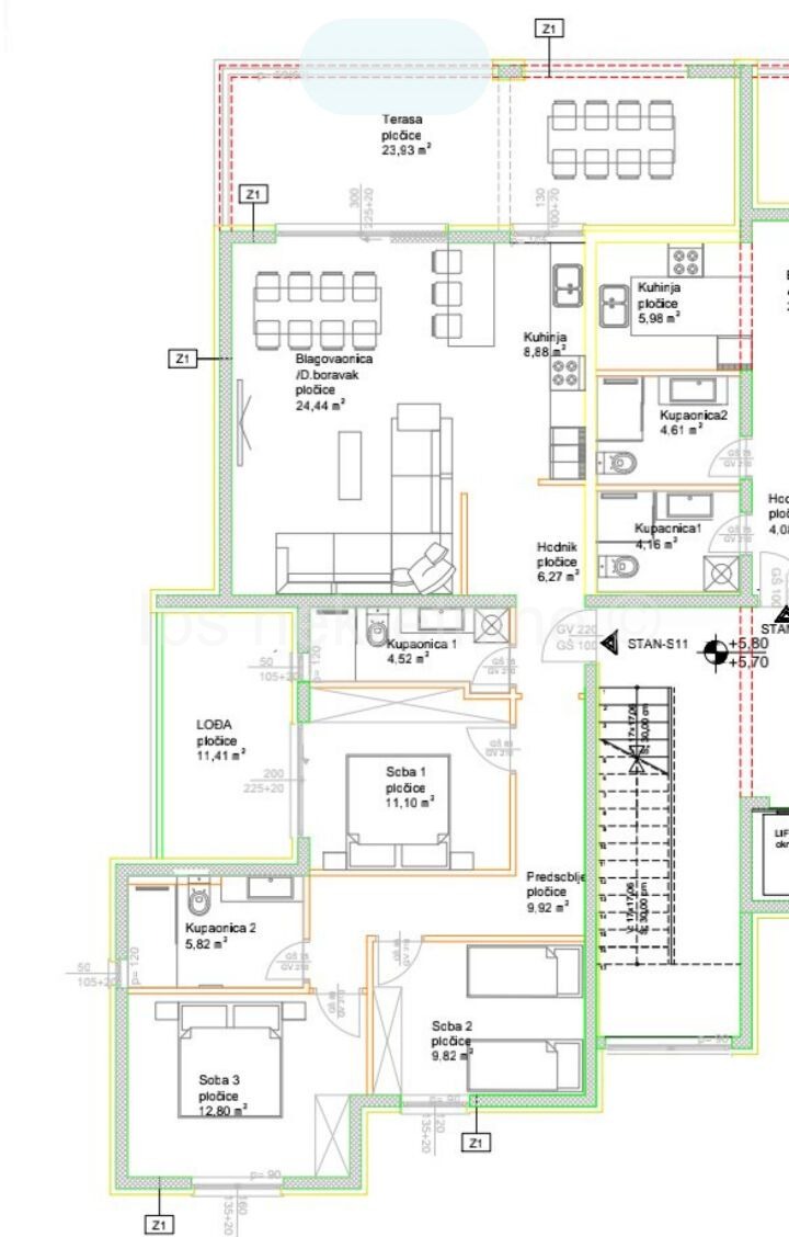 Opis: Posredujemo pri prodaji Penthouse stana u izgradnji na otoku Čiovo, Okrug Gornji s prekrasnim pogledom. Stan se nalazi na vrhu male stambene zgrade s ukupno 11 stanova. Ukupna unutarnja površina stana je 93m2, a vanjski, otvoreni dio se sastoji od Loggia 11,4m2 i dvije terase od 24m2 i 94m2. Unutarnji dio se sastoji od kuhinje, ,dnevnog boravka, blagovaonice, hodnika, kupaonice, predsoblja, tri(3) spavaće sobe i kupaonice. Na samoj krovnoj terasi je predviđeno mjesto za bazen ili Jacuzzi s potrebnim instalacijama. U zgradi postoji lift(pristup invalidima), velike staklene stijenke na aluminijskim balkonskim vratima s električnim roletnama, komarice, podno grijanje, vrhunski klima uređaji. Stanu pripada jedno parkirno mjesto. Udaljenost od gradske plaže iznosi oko 250m a do centra mjesta oko 350m.