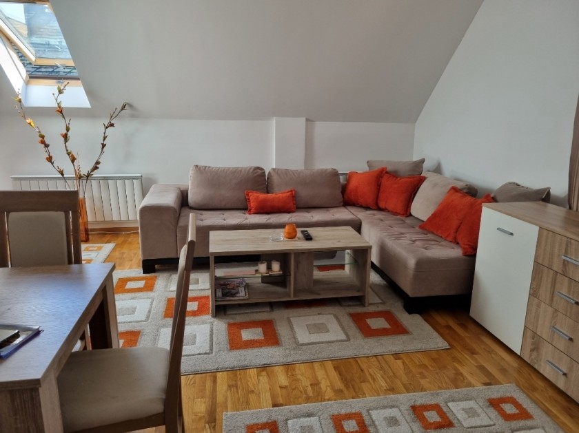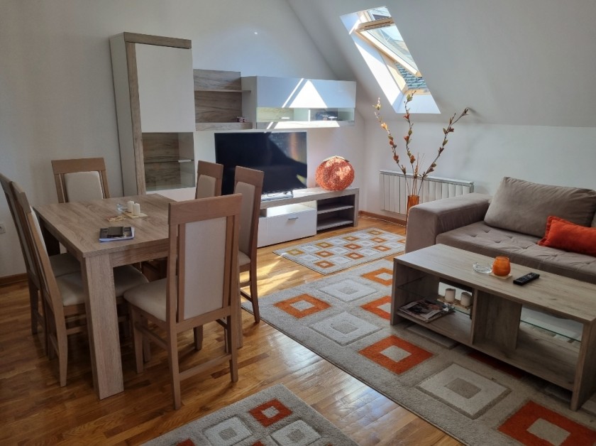 Opis: Prodaje se apartman u mirnom delu Zlatibora, na samom ulazu u kompleks Zlatiborski konaci, preko puta recepcije. Po strukturi je duplex, veličine 90 m2 i nalazi se na 2 spratu zgrade. Poseduje dnevni boravak sa trpezarijom i kuhinjom, dve spavace sobe, dva kupatila ,dva hodnika i terasu. Moguće ga je fizički podeliti u 2 zasebne stambene jedinice, na dupleks i garsonjeru od 26m2.