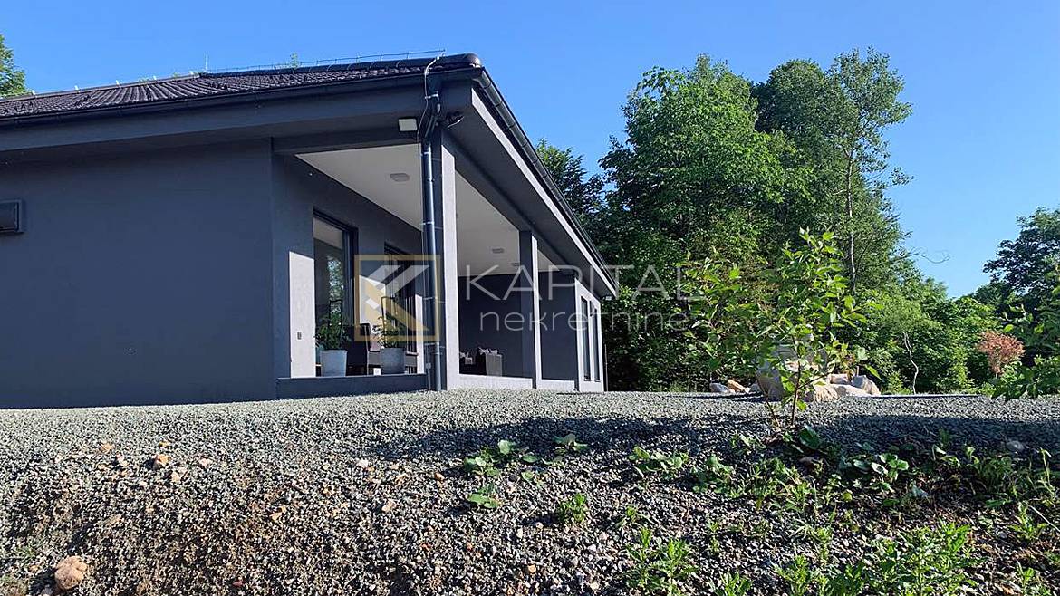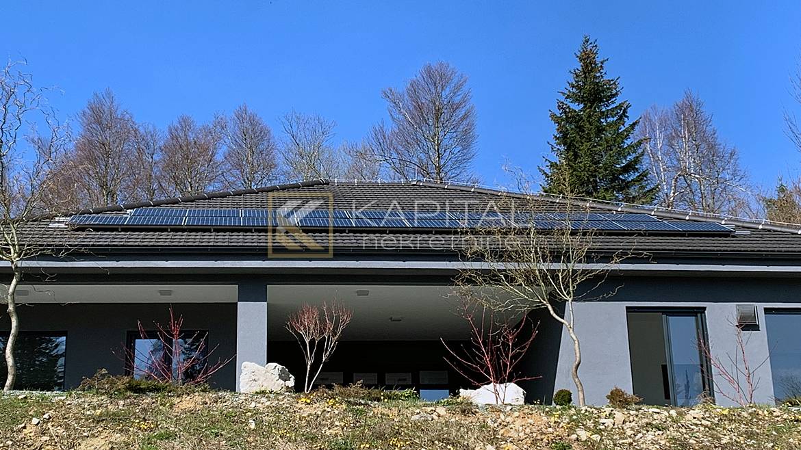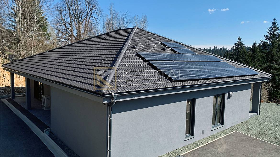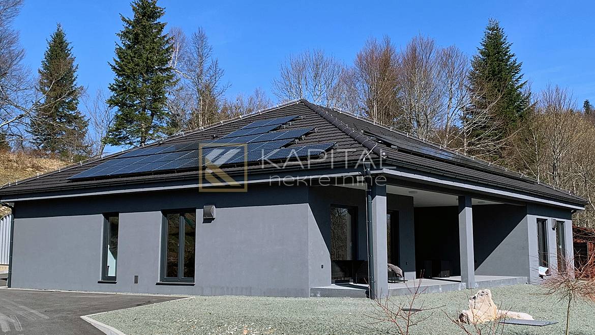 Opis: Posredujemo u prodaji montažne, energetski visoko učinkovite kuće koja se nalazi u dijelu netaknute prirode u blizini jezera, na samo pola sata vožnje od Rijeke. Izgrađena je kao prizemnica od 281 m2 btto površine uz mogućnost uređenja tavanskog prostora, koji je većinom stajaće visine. Stambeni prostor čine prostrana kuhinja s blagovaonom i dnevnim boravakom, tri sobe, (od kojih dvije imaju vlastite garderobe i kupaone), hodnika, ostave i gostinskog toaleta. Garaža je povezana sa stanom. Tri natkrivene vanjske terase daju poseban šarm ovoj nekretnini. Kuća je izgrađena vrhunskim materijalima, dobro i kvalitetno izolirana s razvedenim podnim grijanjem. Vanjska stolarija u kući je sedmokomorni PVC profil, s troslojnim termoizolacijskim staklom ispunjenim inertnim plinom te vanjskim aluminijskim roletama sa sklopivim komarnicima. Na kući su ugrađena dva rekuperatora koji osiguravaju ventilaciju bez gubitaka temperature. Podno grijanje objekta i sanitarne vode (300 l) je riješeno sa 16kW Dimplex dizalicom topline, a odrađena je i kompletna priprema za ugradnju 4 Fan-Coil jedinice za hlađenje. Razvod tople vode je recirkulacijski, s konstantnim protokom tople vode....