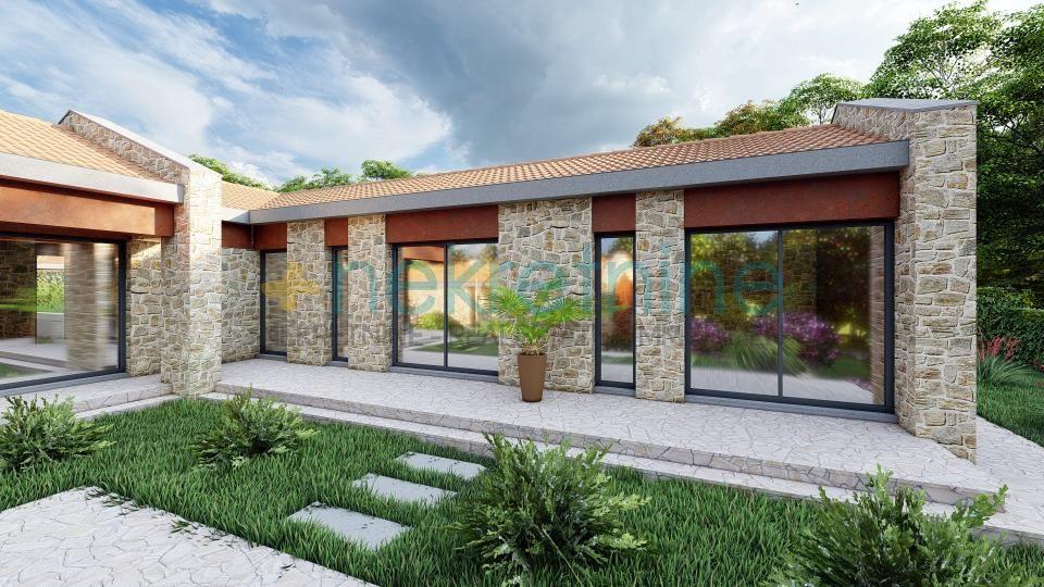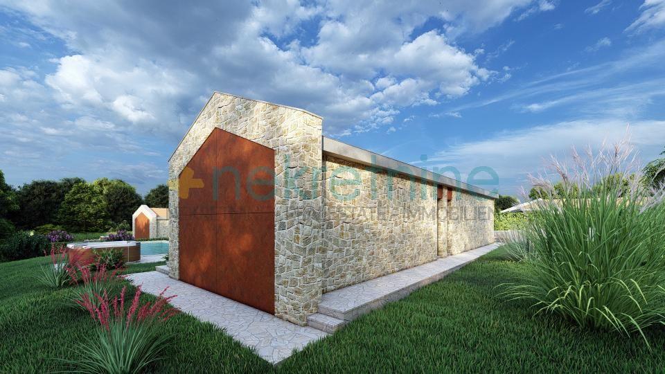 Na čestici će se izgraditi stambena zgrada pretežito pravokutnog oblika sa jednom stambenom jedinicom, katnosti Pr, max tlocrtnih dimenzija 19,60 x 16,50 m i visine 3,84 m, mjereno od najniže kote uređenog terena do gornjeg ruba stropne konstrukcije te pomoćna građevina nenatkriveni bazen max dimenzija 11,00 m x 4,50 m. Prizemlje sadrži kuhinju, blagavaonicu i dnevni boravak sa izlazom na natkrivenu terasu, ulazni prostor, hodnik, kupaonicu, strojarnicu/vešeraj, dvije spavaće sobe svaka sa pripadajućom kupaonicom i treću sobu koju investitor može urediti kao spavaću sobu, radnu sobu, igraonu ili saunu. Svi vanjski prostori objekta su orijentirani SI. Ulaz u kuću je sa jugozapadne strane.