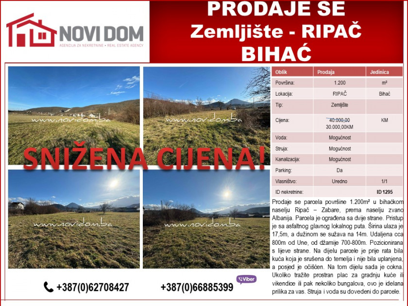 Prodaje se parcela površine 1.200m² u bihaćkom naselju Ripač – Zabare, prema naselju zvano Albanija. Parcela je ograđena sa dvije strane. Pristup je sa asfaltnog glavnog lokalnog puta. Širina ulaza je 17,5m, a dužinom se sužava na 14m. Udaljena cca 800m od Une, od džamije 700-800m. Pozicionirana s lijeve strane. Na dijelu parcele je prije rata bila kuća koja je srušena do temelja i nije bila uplanjena, a posjed je očišćen. Na tom dijelu sada je cokna. Ukoliko tražite prostran plac za gradnju kuće ili vikendice ili pak nekoliko bungalova, ovo je idelana prilika za vas. Struja i voda su dovedeni do parcele.