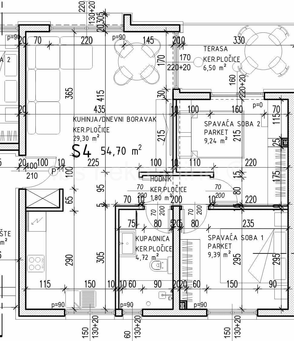 Stan se sastoji od dnevnog boravka, kuhinje i blagovaonice kao jedne cjeline, dvije spavaće sobe, kupaonice, hodnika ukupne površine 54,45 m2 te natkrivene terase od 6,50 m2. Stan uključuje i jedno vanjsko parkirno mjesto.