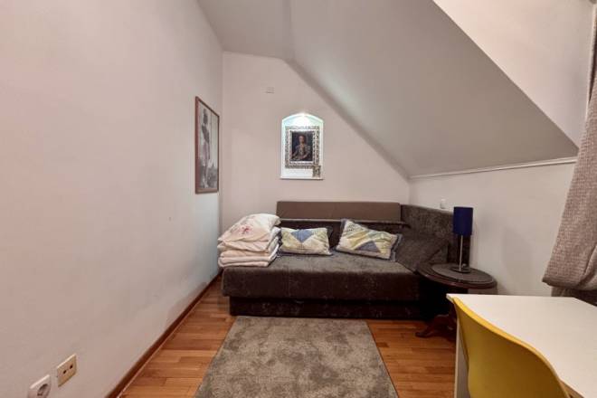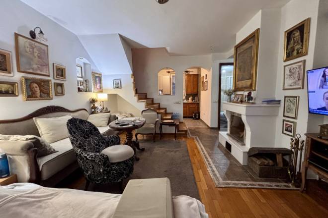 Prva etaža odiše komforom i funkcionalnošću: ulazni hodnik vodi ka velikoj kancelariji, dok centralni deo čini prijatan i svetao dnevni boravak sa funkcionalnim kaminom, koji prostoru daje posebnu toplinu i karakter. Iz dnevnog boravka izlazi se na komfornu terasu okrenutu ka ulici. Tu je i odvojena kuhinja sa trpezarijom, kao i jedno kupatilo. Stepenice iz dnevnog boravka vode na gornji nivo, gde se nalaze dve spavaće sobe (jedna veća, druga manja), dodatno kupatilo i još jedna, znatno veća terasa, savršena za potpuni mir, jutarnju kafu ili večernje opuštanje. Stan je lepo očuvan, dok je sama zgrada lepo održavana, sa velikim i reprezentativnim ulazom koji ostavlja snažan prvi utisak.