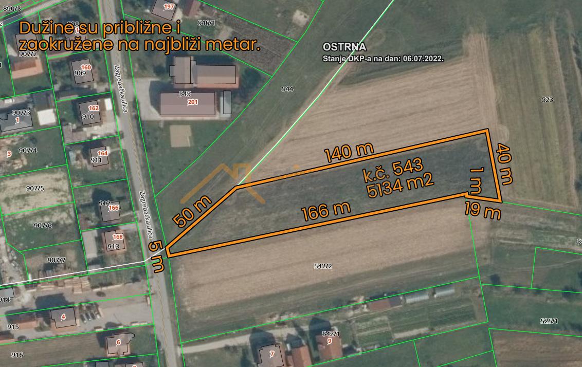 Opis: Prodaje se zemljište u naselju Mala Ostrna, Dugo Selo, prednji dio zemljišta nalazi se u građevinskoj zoni – stambene namjene (cca 1000 m2), dok je ostatak parcele van građevinske zone Ukupna površina zemljišta iznosi 5134 m2.