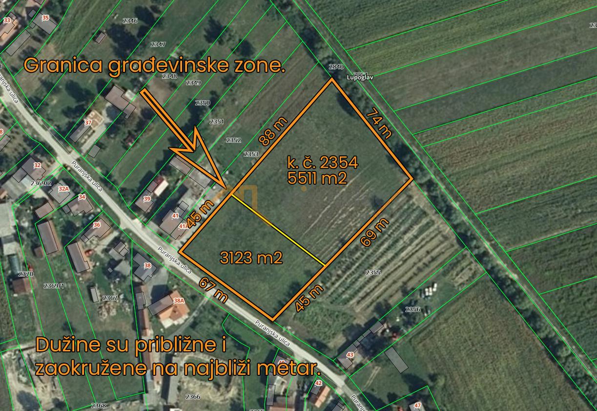 Opis: Prodaja, Zemljište, Lupoglav, Puranjska ulica 8634 m2 10€/m2 Od ukupne površine zemljišta građevinsko područje iznosi cca 3123 m2 dok je ostatak zemljišta od 5511 m2 van građevinskog područja. Širina građevinskog dijela prema ulici je cca 67 m, dok je dubina cca 45 m.