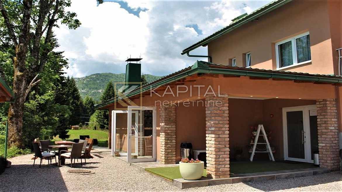 Opis: Prodajemo villu sa 6 studio apartmana i prostorijama za druženje (teretana, dnevni boravak/sala za ručavanje, kuhinja, recepcija..). Pripada joj i manji objekt također preuređen u zaseban apartman. Ispred objekta je veliki parkirni prostor. S velike terase ispred dnevnog boravka pruža se pogled na livade i šume. Teren u tom dijelu (4000 m2) se također prodaje u sklopu ove cijene tako pa sveukupno parcela iznosi blizu 6000 m2. Villa je odlična investicija za najam turistima i lovcima jer je u neposrednoj blizini skijaški centar Bjelolasica, a obližnje šume obiluju divljači (medvjedi, srne..). Prometna povezanost je odlična, udaljenost do mora je manja od sat vremena (cca 50 km do Novog Vinodolskog), a do Ogulina manje od 20 minuta. Za sve dodatne informacije nazovite 099/2196-353 ili 091/540 8520.