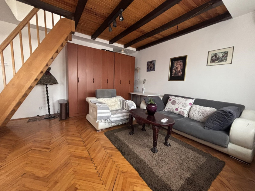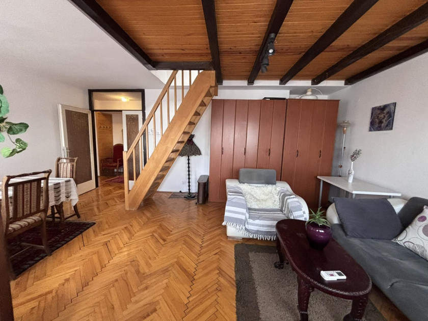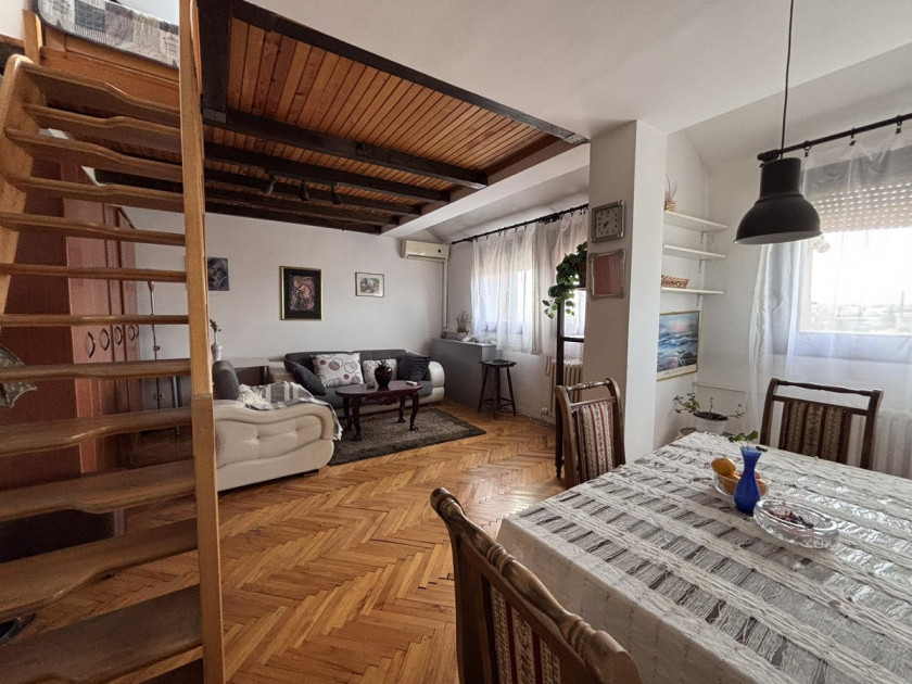 Stan je izuzetno svetao, sa panoramskim pogledom na grad. Nalazi se u održavanoj zgradi sa dva lifta. Površina donjeg nivoa je 47m², a galerije 13m². Sastoji se od hodnika, dnevnog boravka, odvojene kuhinje, kupatila i spavaće sobe na galeriji. Grejanje je na struju – klima i Cini radijatori.