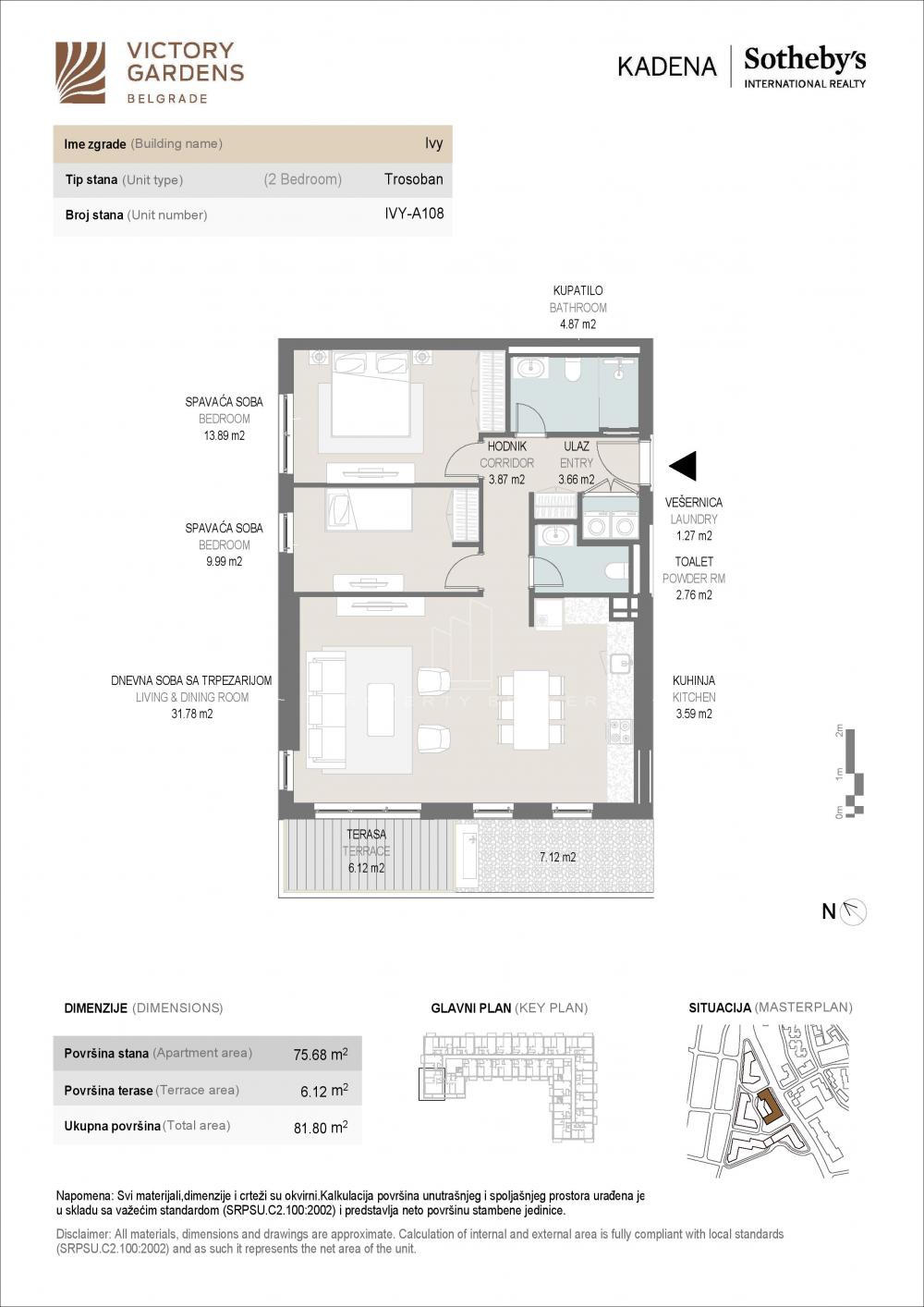 Opis: Victory Gardens-savremeni stambeni kompleks na dva minuta od Ade i Požeške ulice. Nudimo stan u I fazi izgradnje u zgradi Ivy na II spratu. Ugaona pozicija, dvostrano orijentisan, svetao, funkcionalan. Zbog par nivoa ispod ima visinu četvrtog sprata. Stan se sastoji od: ulaznog dela, dnevne sobe sa trpezarijom i kuhinjom sa direktnim izlazom na terasu, dve spavaće sobe, kupatila, toaleta i vešernice.