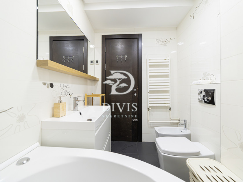 Raspored je odlično rešen: komforan dnevni boravak sa trpezarijskim delom i fizički odvojenom, opremljenom kuhinjom, dve spavaće sobe koje izlaze na terasu, dva kupatila (uz svaku spavaću sobu), kao i dodatni toalet za goste.