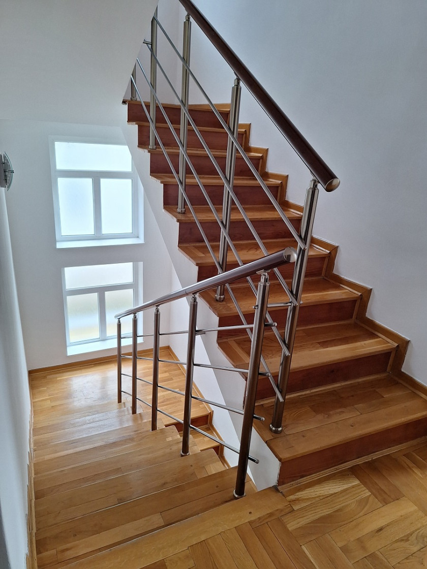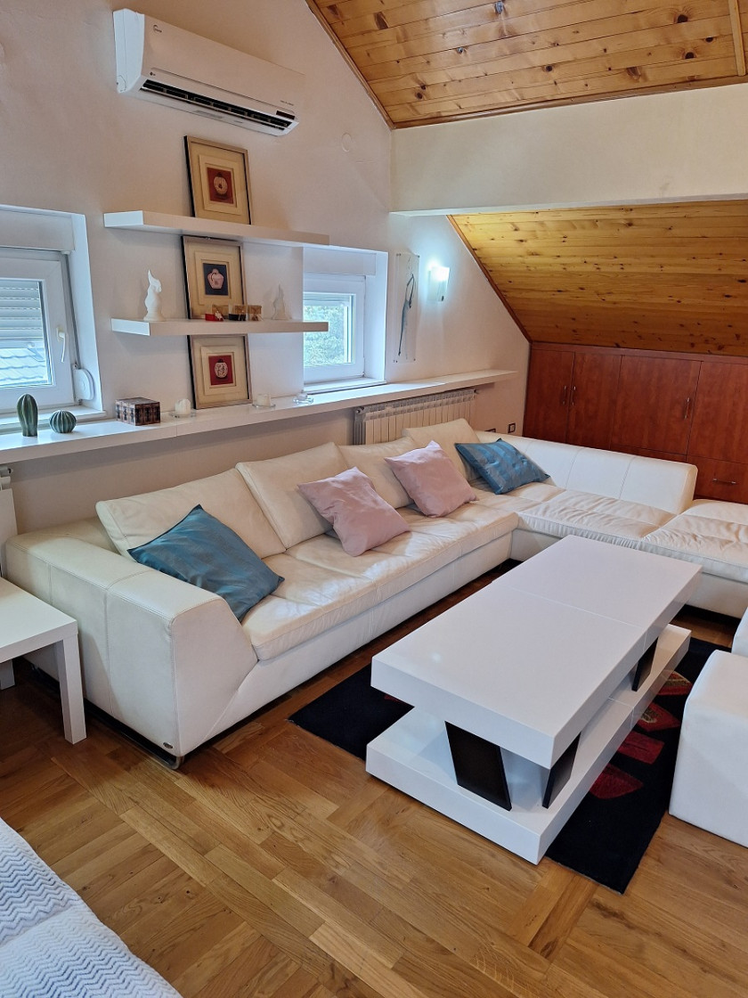 Kuća se sastoji od tri etaže i to prizemlja, sprata i potkrovlja. Raspored prostorija uključuje: šest soba, dve kompletno opremljene kuhinje, tri kupatila (po jedno na svakoj etaži), tri terase, podrumski prostor u kom se nalazi sa kotao na pelet. Mogućnost grejanja na struju, inverter klima uređaji na svakom spratu.