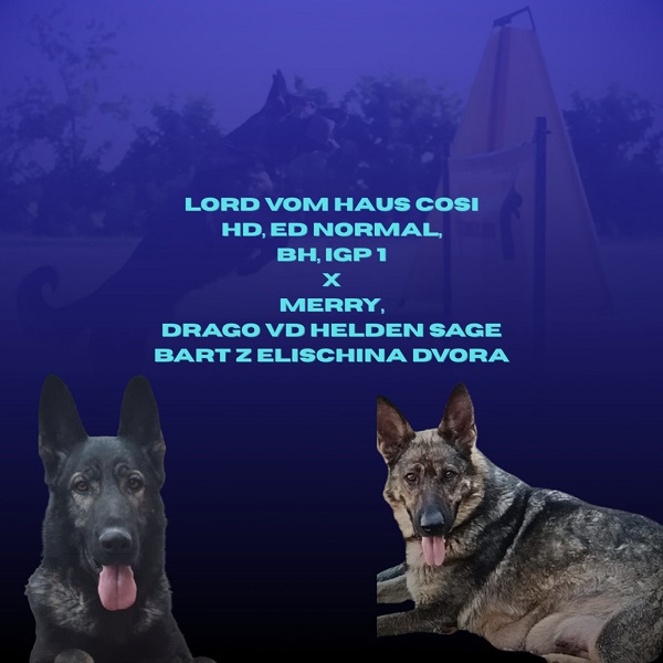 Otac: Lord vom Haus Cosi HD ED normal BH, IGP1 ispit u radu sin svetskog šampiona u radu Gero z Beronske Basty WUSV WORLD CHAMPION x Beatrice vom Haus Cosi.