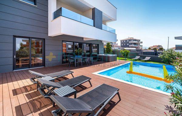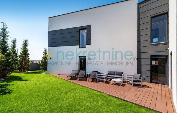 Moderna vila u Novalji na otoku Pagu oduševljava svojim sofisticiranim i elegantnim dizajnom. Smještena nedaleko od mora, ova luksuzna vila pruža prekrasan pogled na Jadransko more i okolni krajolik, kombinirajući udobnost i suvremeni stil života.