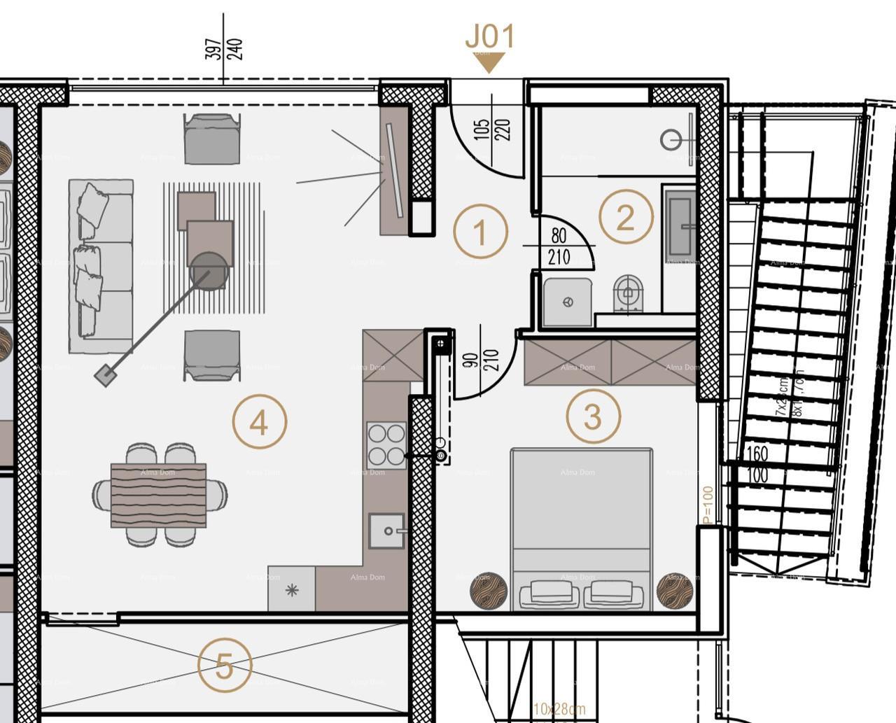 Stan J01, nalazi se u prizemlju južne zgrade i sastoji se od: hodnika+garederoba, dnevnog boravaka, sa kuhinjom i blagovaonicom, spavaće sobe, kupatila i spremišta.