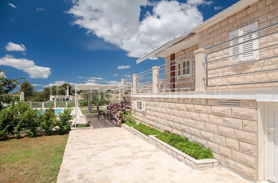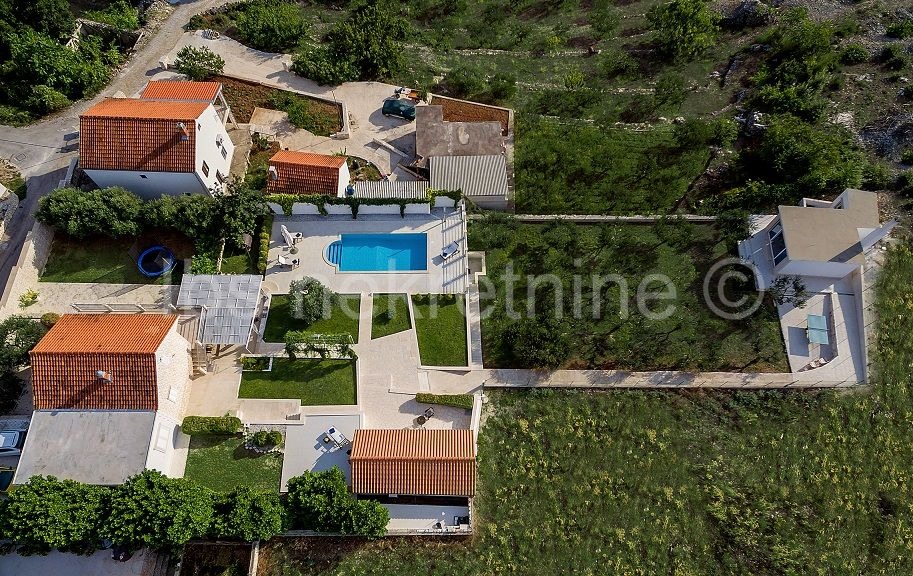 Prostor oko kuća, bazena i staze između istih je popločan kamenom dok je ostatak parcele kultiviran mediteranskim biljem uključujići i maslinik.