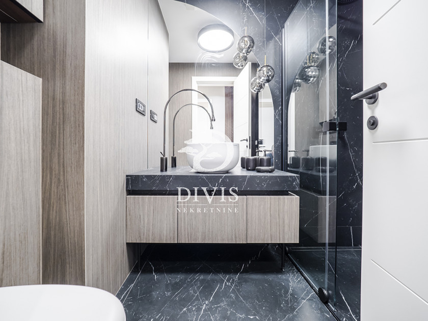 Stan je opremljen najkvalitetnijim italijanskim nameštajem renomiranih dizajnera poput Paolo Cattelana, Archirivolto, kuhinja je ručno izrađena, postavljene Florim keramičke ploče, slavine su od legura mesinga i srebra brenda Gessi. Svaki detalj je temeljno isplaniran. Kvake su britanskog brenda Buster&Punch od punog mesinga rafinirane ručno u završnoj fazi dijamantskim rezbarenjem. Spoljna stolarija drvo aluminijum. Sigurnosna Bosalova vrata. Grejanje je centralno po potrošnji. Podno grejanje u oba kupatila. Zgrada kao i stan poseduju smart sistem, protiv požarni i protiv poplavni sistem.