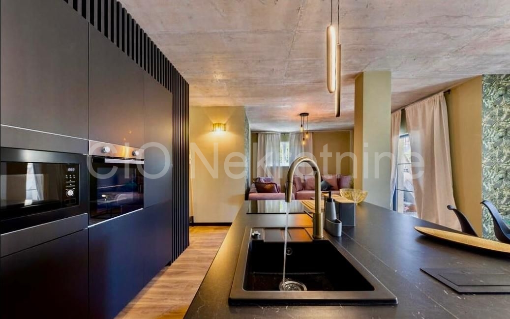 Sastoji se od 2 spavaće sobe, kupaonice, kuhinje, blagavaonice i dnevnog boravka i balkona. Ima klimu, tv, perilicu, neograničeni internet, vrt sa vrtnim namještajem i roštiljem, privatni bazen, wc sa saunom i mogućnost korištenja jacuzzia, parking i poseban ulaz.