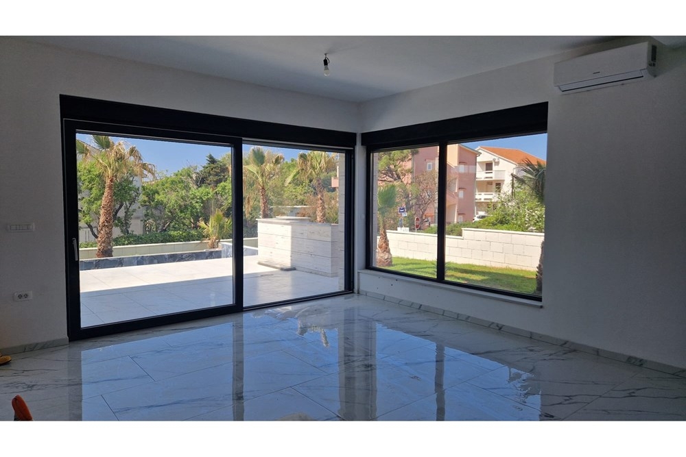 U prizemlju se nalazi dnevni boravak, blagovaonica, kuhinja, toalet, iz dnevnog boravka izlazi se na sunčalište i bazen s preljevom i masažom veličine 10x5m (bazeni dolaze s kompletnom dodatnom opremom što su slapovi za masažu, automatski dozatori).