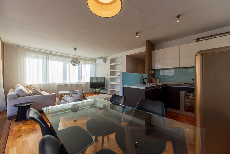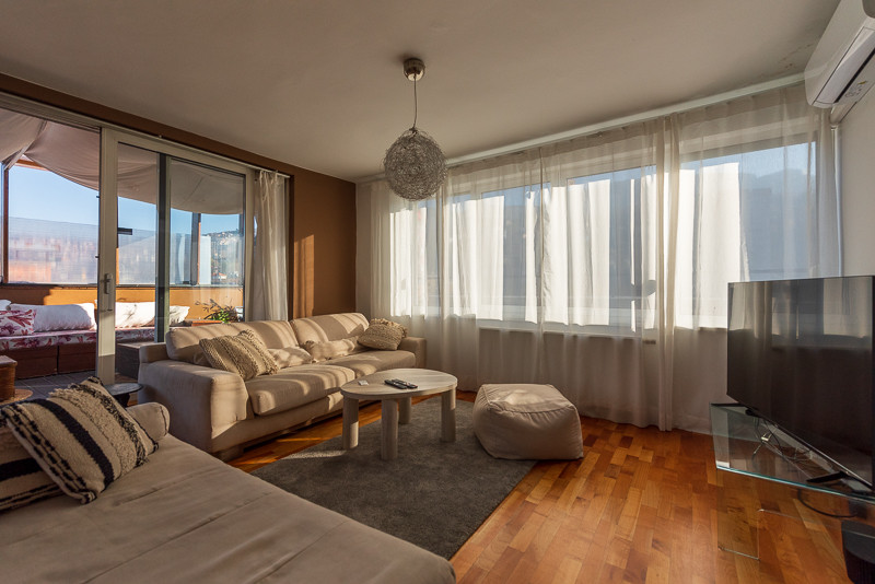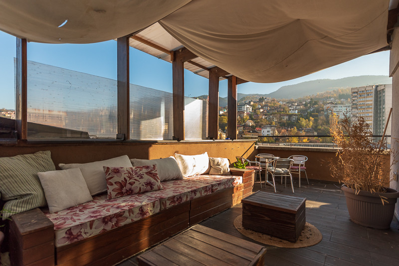 Opis: Iznajmljuje se romantičan renoviran stan površine 70 kvadratnih metara sa terasom površine 30 kvadratnih metara, a koji je smješten u centru Sarajeva, na izvrsnoj lokaciji, i udaljen samo par koraka od Narodnog pozorišta. Stan sadrži: veoma prostranu dnevnu sobu sa kuhinjom i trpezarijom, jednu spavaću sobu, kupatilo, toalet i veoma prostranu dvostrano orjentisanu terasu sa lijepim pogledom. Stan je opremljen modernim namještajem, kao i svim neophodnim električnim uređajima, brzom internet konekcijom, kabl TV konekcijom, nedavno je renoviran, pri čemu je, kombinujući čiste linije, ambijentalno osvijetljenje i moderne dekoracije, dizajner interijera napravio odličan posao. Više informacija možete dobiti na vlastiti zahtjev.