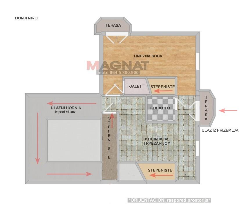 Donji nivo: ulazni hodnik sa stepenišnim postorom za sprat (oko 12m2), antre, kuhinja sa trpezarijom i terasom, stepenište za potkrovlje i u hodniku izlaz za krovnu terasu, kupatilo i stepenište za potkrovlje gde se nalazi još jedna velika soba, dnevna soba sa terasom, toalet;