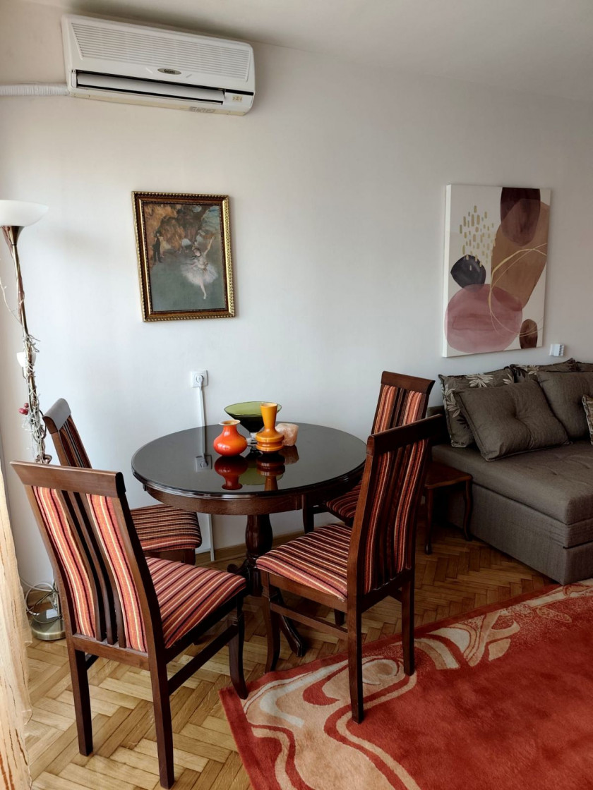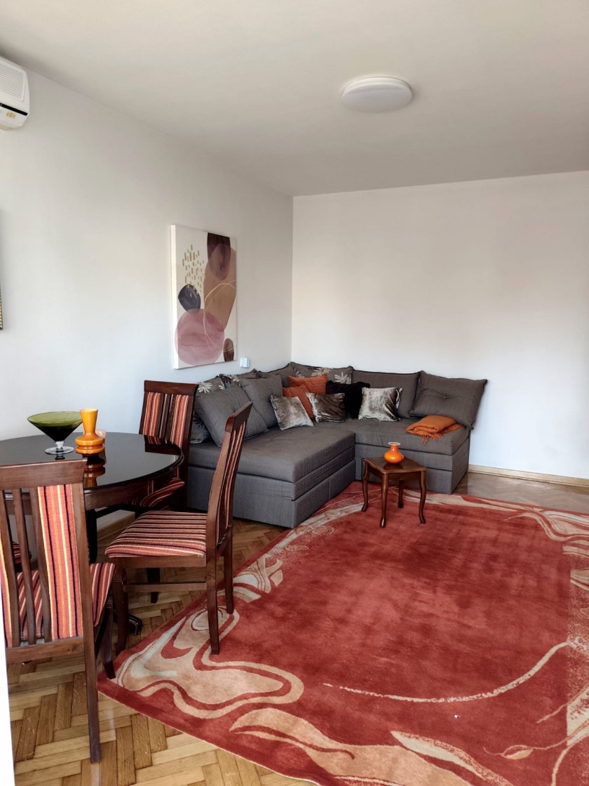 Dnevni boravak sa kuhinjom i trpezarijom, spavaća soba, hodnik, kupatilo, terasa i zastakljena lodja. Poseduje klimu, internet i dva televizora.