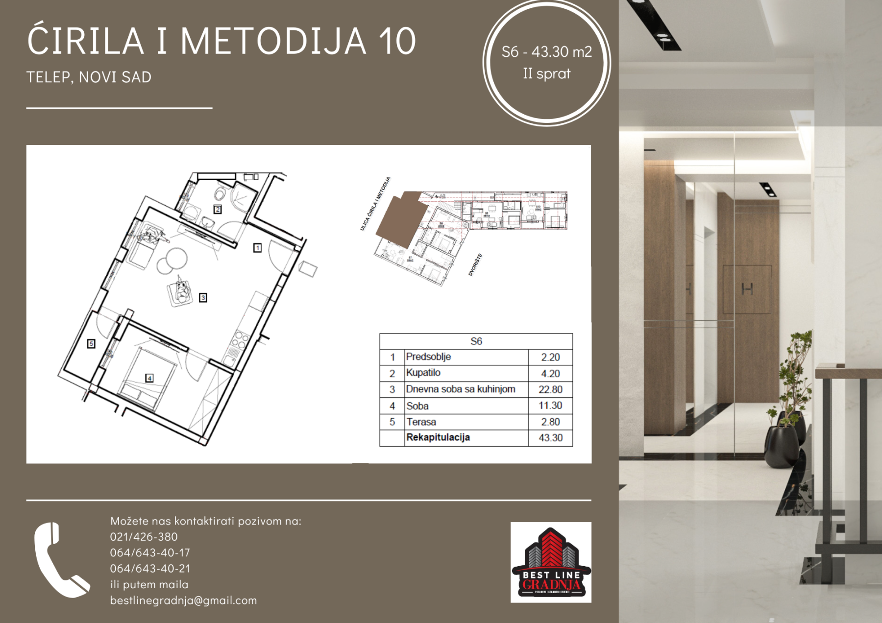 Opis: Prodaje se jednoiposoban stan - 43.30 m2 na drugom spratu (isti stan je dostupan i na prvom spratu)2.800 €/m2 sa PDV-om Direktno od investitora!Mogućnost povrata PDV-a. Gradnja kreće u aprilu! Opremljenost u stanovima:* PVC petokomorna stolarija* Sigurnosna ulazna vrata* Medijapan unutrašnja stolarija* Italijanska keramika prve klase* Ugradni vodokotlić* Tarket* Lift* Grejanje na toplotne pumpe Za sve dodatne informacije posetite naše web stranice:https://bestlinegradnja.rs/www.best-nekretnine.comili nas kontaktirajte telefonom na sledeće brojeve:021/426-380064/643-40-21064/643-40-17(Agencija za nekretnine BEST, Novi Sad, Reg. br. 393)