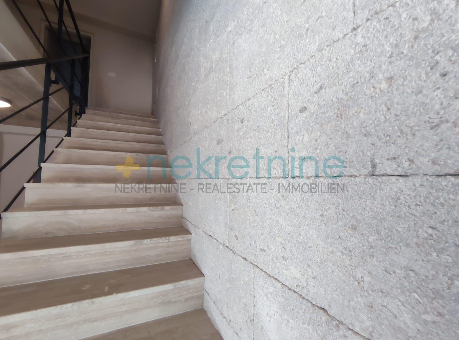 Središnji element interijera su unutarnje stepenice obložene bračkim kamenom, koje vode na prvi kat, gdje se nalaze dvije prostrane spavaće sobe, svaka sa svojom elegantno uređenom kupaonicom. Rustikalni detalji poput ciglenog zida u kuhinji i betonskih stropova premazanih zaštitnim slojem stvaraju autentičan i profinjen ambijent.