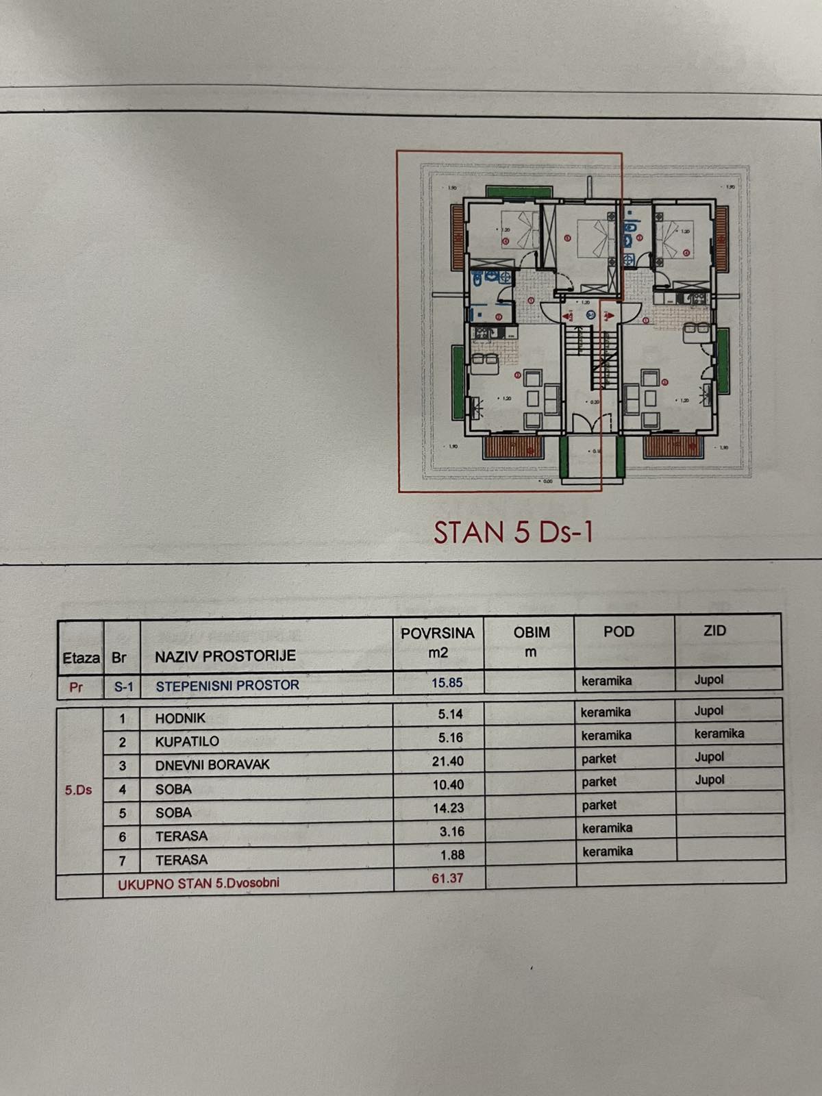Opis: Prodaje se stan u Zagoriču 61m2, dostupan na visokom prizemlju i prvom spratu manje i luksuznije stambene zgrade. Stan se sastoji od: ulaznog hodnika, dnevnog boravka trpezarije i kuhinje, kupatila, dvije spavace sobe i dvije terase. Kupcu je u sklopu cijene uracunato parking mjesto pod lancem na daljinski.