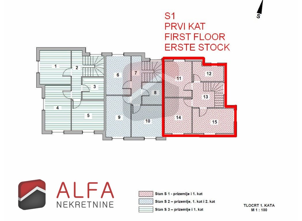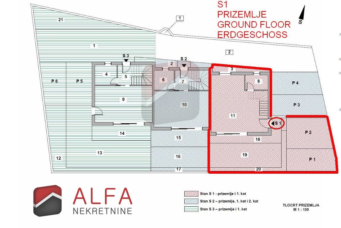 Stan S1 ima zaseban ulaz odvojen od drugih stanara i sastoji se od dvije etaže i velike terase. Nalazi se u objektu s tri povezane stambene jedinice (kuća u nizu).